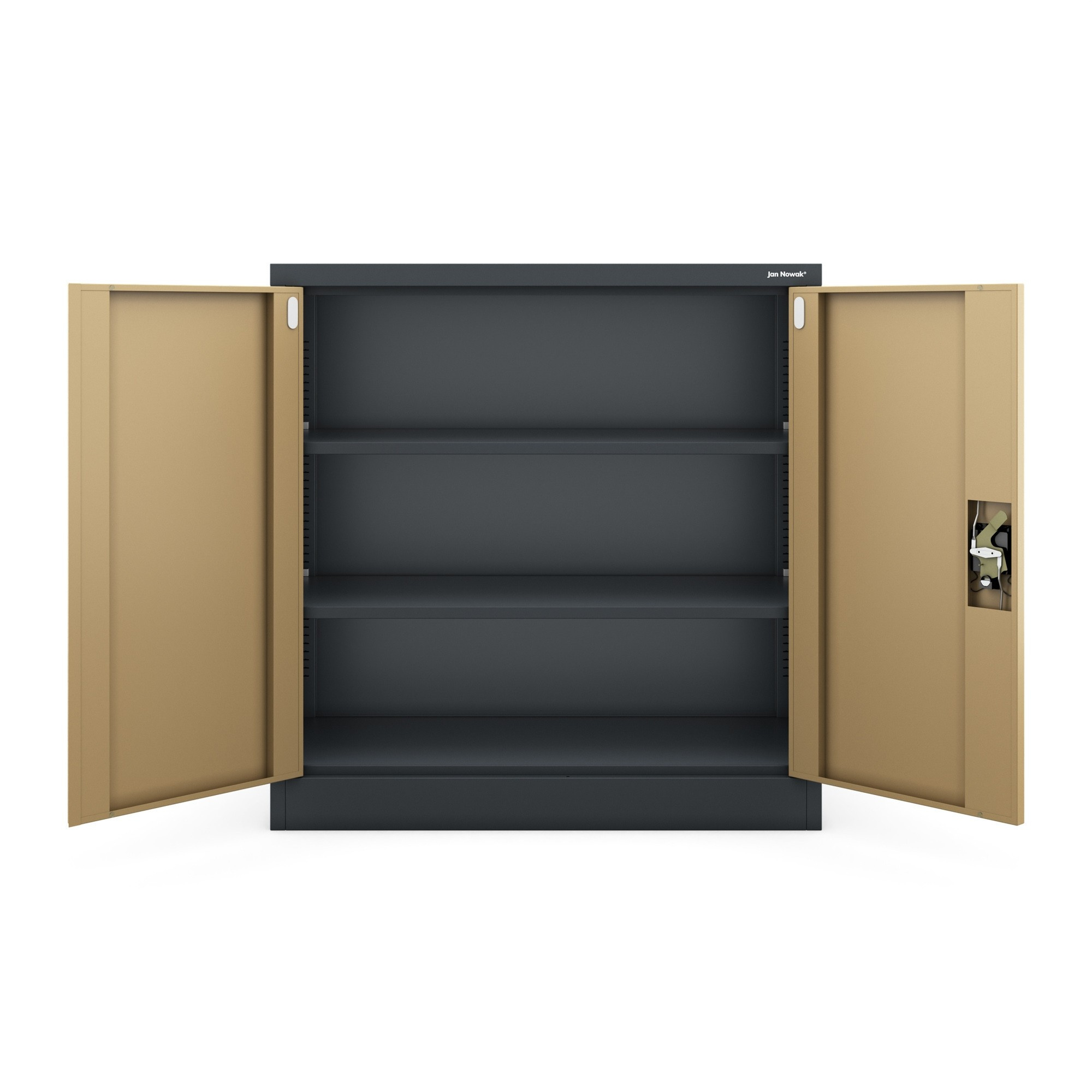Kovová skříňka do kanceláře BEATA, 900 x 930 x 400 mm, Eco Design, antracitová/ořech Kovová skříňka do kanceláře BEATA je mimořádně kompaktní nábytek. Malé rozměry umožňují umístit model jak do velké, tak i do malé místnosti. Díky klasické konstrukci kovové skříňky s dvojitými dveřmi se vám podaří zavést vytoužený pořádek v dokumentech. Přispějí k tomu dvě nastavitelné police. Velkou výhodou je skutečnost, že jejich umístění můžeš snadno změnit kdykoliv. Pohodlně v ní uložíte spisy, šanony, složky, nejdůležitější předměty nebo léky.Kde se uplatní skříňka BEATA? Kovová skříňka BEATA vypadá výjimečně. Je to zásluha rovnoměrně pokrytého práškovou barvou, antracitového rámu a jedinečných dveří, které dokonale připomínají skutečné dřevo. Kovový nábytek dodává prostoru charakter, skvěle se hodí do: kanceláří, úřadů, sekretariátů, děkanátů, ordinací, lékařských ordinací, kosmetických salonů, SPA, domácích kanceláří. Balená kovová skříňka BEATA V kovové skříňce do kanceláře uložíte až 25 šanonů, což je v případě tak malých rozměrů vynikající výsledek! Maximální zatížení modelu BEATA je 200 kg. Dvě nastavitelné police po 25 mm ti umožní individuálně přizpůsobit vnitřek podle tvých potřeb. Dveře zabezpečíte závorovým zámkem (včetně 2 klíčů). Kovová skříňka je navržena tak, aby uchovávala dokumenty obsahující osobní údaje v souladu s GDPR. Solidní a odolná skříňka do kanceláře BEATA je odolná vůči mechanickému poškození. I při maximálním zatížení zůstává stabilní. Je to zásluha odolné oceli o tloušťce 0,6 mm a práškové barvy, kterou jsme použili při výrobě nábytku. Skříňka BEATA uchová vaše dokumenty po dlouhá léta.Skříňka ladící s interiérem kanceláře Kovová skříňka BEATA z kolekce Eco Design se skvěle hodí do kancelářských interiérů a ordinací lékařů. Čela pokrytá speciální ekologickou barvou připomínají vzhledem ořechové dřevo. Díky tomu se nám podařilo zmírnit surový charakter nábytku vyrobeného z oceli. Celkový vzhled je fascinující svou neobvyklostí, přičemž skříňky do kanceláře zůstávají stále odolné a bezpečné. Kovová skříňka do kanceláře BEATA: Výška: 93 cm Šířka: 90 cm Hloubka: 40 cm Hmotnost: 24 kg Barva: korpus: antracit (RAL 7016) / čela: ořech Maximální zatížení 200 kg Zatížení police do 50 kg Konstrukce: ocel lakovaná práškovou barvou Další informace: Certifikát PZH Záruka kvality Kovová skříňka do kanceláře je určena k samostatné montáži. Proces není složitý, nicméně abychom ti usnadnili a urychlili práci, vytvořili jsme video návod.