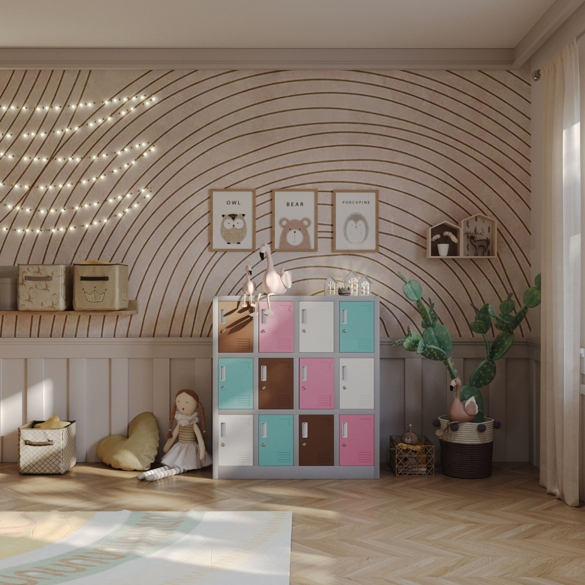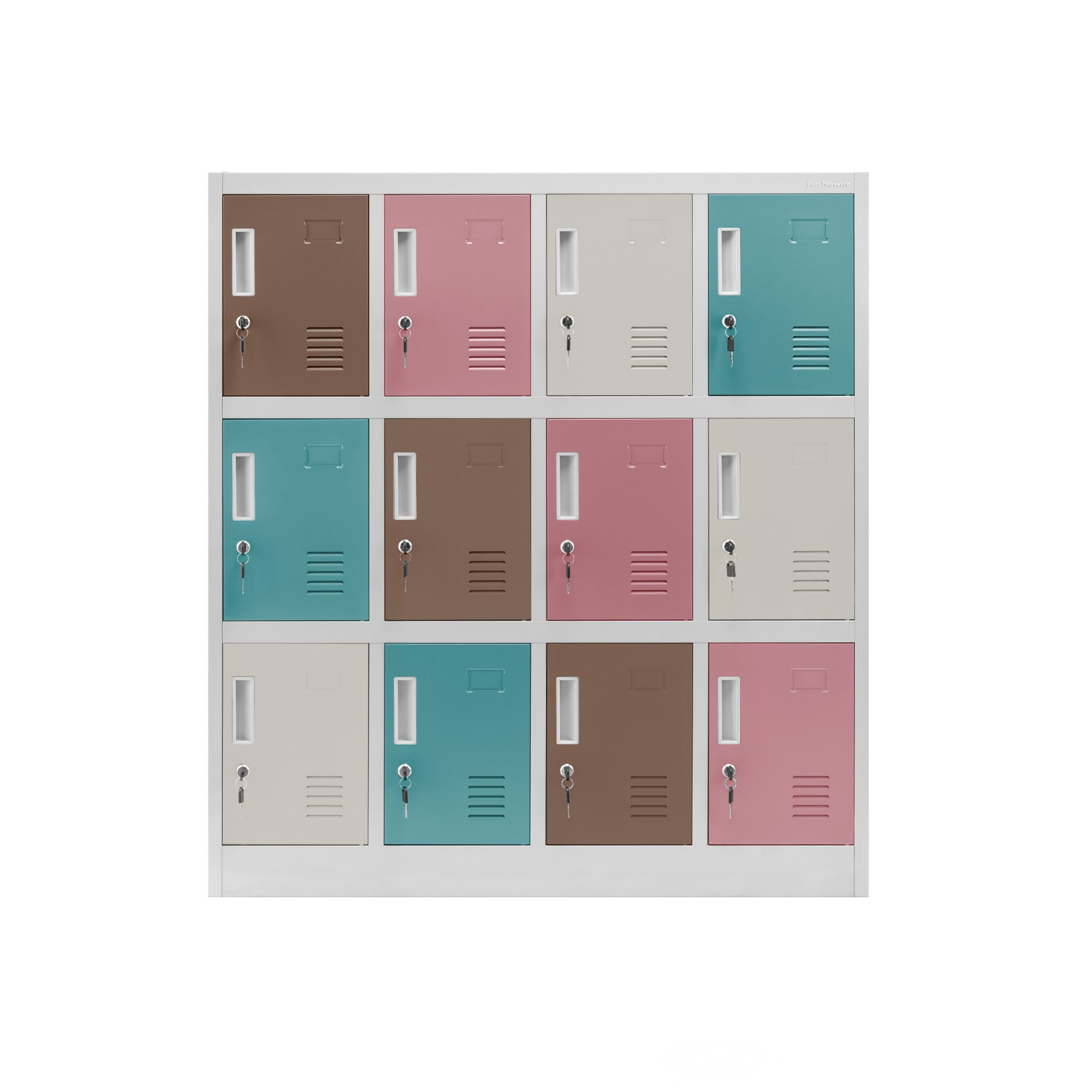 Kovová skříňka do šatny a školky OLA, 1090 x 1200 x 450 mm, šedo-pastelová