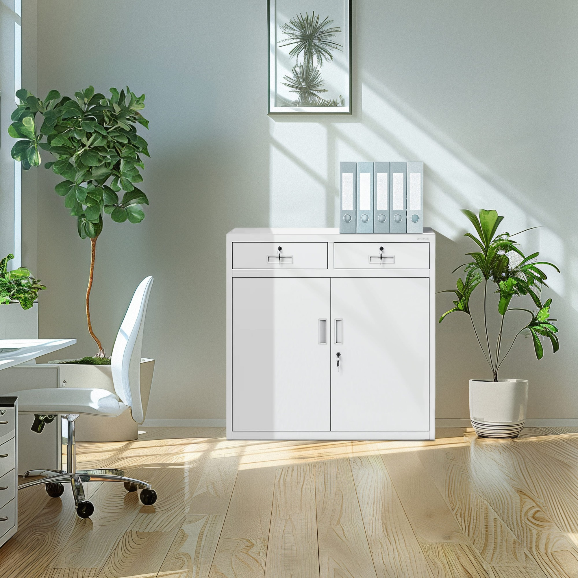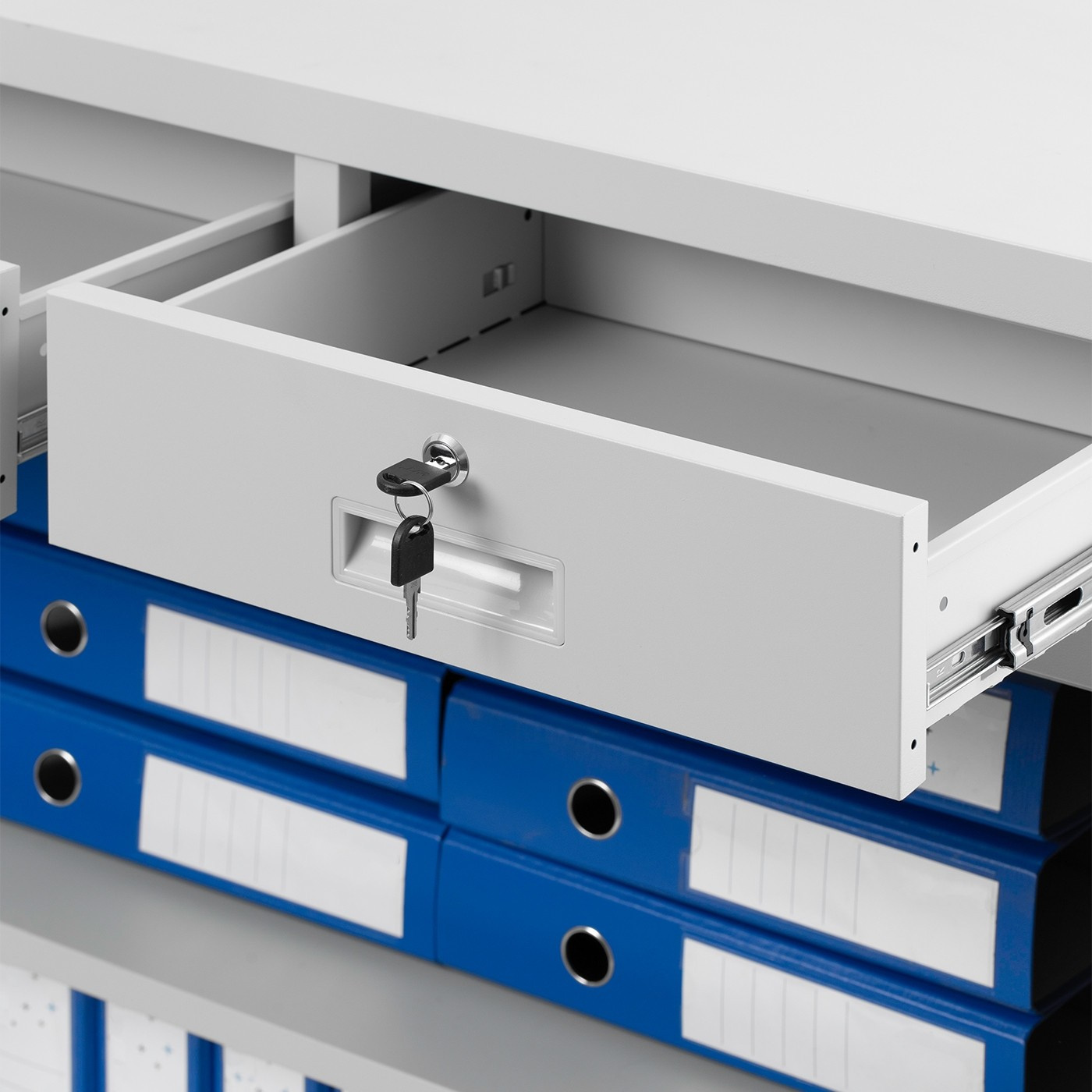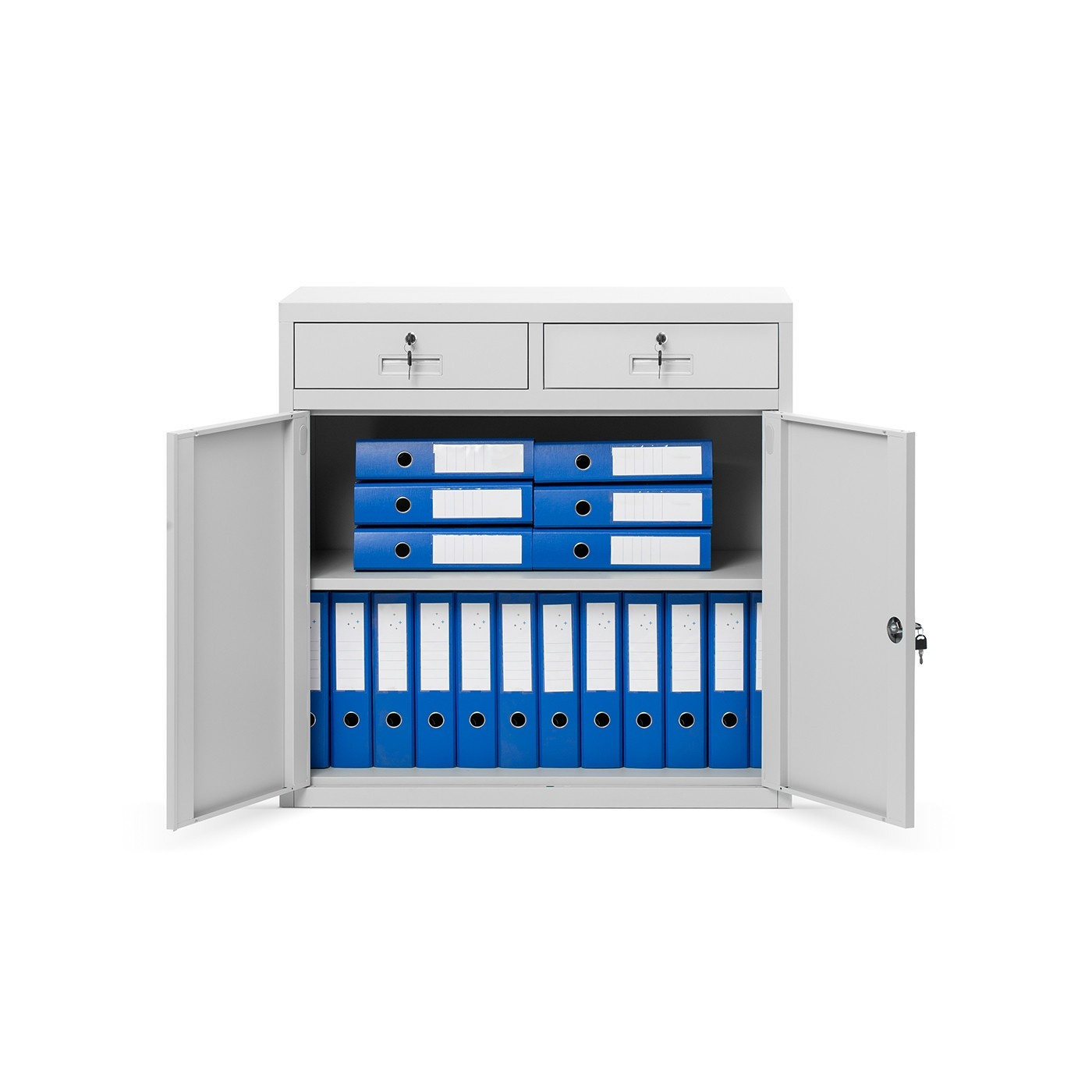 Kovová skříňka se zásuvkami LENA, 900 x 900 x 400 mm, šedá Kovová skříňka se zásuvkami LENA je model vytvořený s ohledem na místa, kde jsou nezbytná praktická a kompaktní řešení. Nábytek jsme vyrobili z odolné oceli, proto je mimořádně pevný a odolný. Skvěle se hodí do kanceláří, ordinací, kosmetických salonů, ale také do garáží, skladů a dílen. Elegantní styl a šedá barevnost zajistí, že kovová skříňka se zásuvkami LENA se hodí jak do klasického, tak moderního prostoru.Prostorná skříňka a pohodlné zásuvky V nízké kovové skříňce LENA najdete dva systémy úložného prostoru: prostornou přihrádku s policí, která rozděluje vnitřek na dvě úrovně, její umístění si nastavujete sami, protože je možné regulovat výšku po 25 mm, dvě zásuvky na pevných, spolehlivých pojezdech, ideální místo pro uložení kancelářských potřeb a drobných nástrojů. Jak zásuvky, tak dvoudveřová skříňka mají zabudované, pevné zámky, ke každému z nich obdržíš dva klíče. Všechny předměty uložené ve skříňce LENA budou dostupné pouze pro osoby, které si vyberete.Kompaktní kovová skříňka se zásuvkami Kovová skříňka se zásuvkami LENA je malý model, na který jsme kladli vysoké nároky. Regulovaná police vám umožní přizpůsobit interiér vašim potřebám. Díky tomu budou uložené předměty dokonale zorganizované a udržování pořádku pro vás bude snadné.Další výhodou kompaktních rozměrů kovové skříňky se zásuvkami je skutečnost, že se vejde všude a nevyvolá efekt přeplnění interiéru. To je skvělá možnost pro malé nebo úzké místnosti.Profesionální řešení pro kancelář Konstrukce z pevné oceli, kterou jsme zabezpečili práškovou barvou, je velmi odolná vůči mechanickému poškození. Plech o tloušťce 0,6 mm a přesně vyřezané prvky, které velmi snadno spojíte dohromady, zajišťují nezbytnou bezpečnost při každodenním používání.S značkou získáváš celý balíček výhod! Soulad s platnými předpisy GDPR umožňuje shromažďování dokumentů obsahujících osobní údaje. Naopak, certifikát PZH ti dává jistotu, že kovová skříňka se zásuvkami LENA splňuje veškeré požadavky na bezpečnost.Skříňka kovová se zásuvkami LENA – technické údaje: Hmotnost (včetně balení): 31 kg Barva: šedá (RAL 7035) Výška: 90 cm Šířka: 90 cm Hloubka: 40 cm Nosnost police do 50 kg Záruka kvality Kovová skříňka se zásuvkami LENA vyžaduje vlastní montáž. Abychom ti usnadnili sestavení nábytku, připravili jsme papírový návod a video verzi (najdeš ji v horní části stránky).