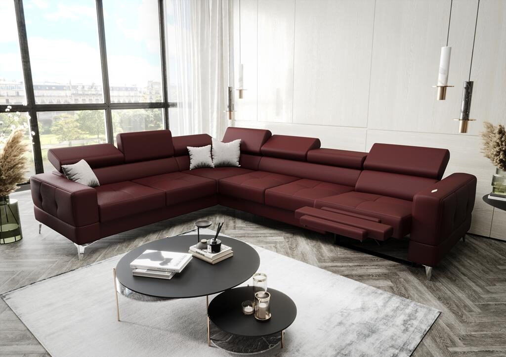 Rohová Kožená sedací souprava s funkcí spaní a , relaxU - TOSCANIA MAX 320x250 cm - vínová , levá