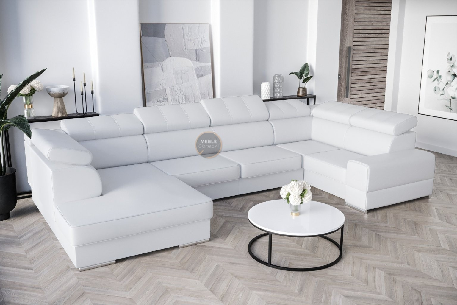 Rohová Kožená sedací souprava s funkcí spaní ROYAL MAX I 210x375x185 - Levá strana, Bílá kůže