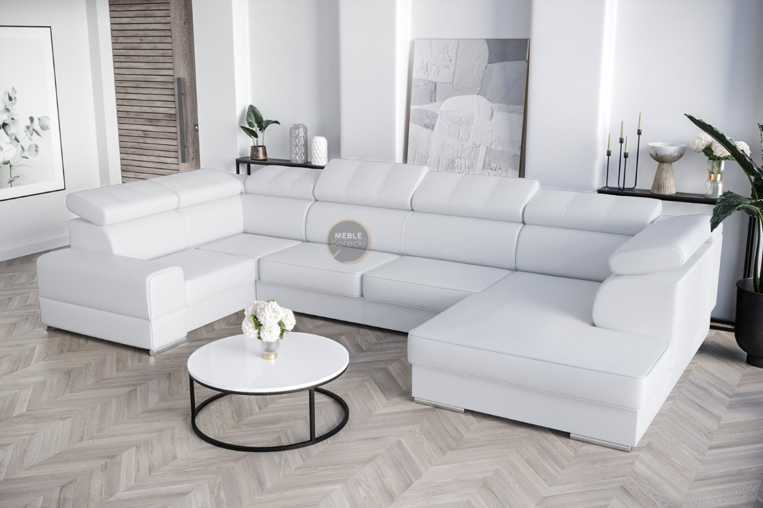 Rohová Kožená sedací souprava s funkcí spaní ROYAL MAX I 210x375x185 - Pravá strana, Bílá kůže