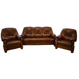 Stylová sedací souprava Royal nadchne každého, kdo má v oblibě rustikální nábytek. Její precizní a kvalitní zpracováním Vám zaručí luxus a pohodlí. Jakmile se do ní jednou usadíte, nebude se Vám chtít vstát. Polstrování sedací soupravy je vyrobené z kvalitní hovězí kůže. Konstrukce je vyrobená z masivního dubového dřeva a je vhodná i k umístění do prostoru. Kůži je nutné čistit pouze za pomocí speciálních prostředků na čištění a konzervaci přírodních kůží, dřevo je třeba čistit suchým měkkým hadříkem. Zobrazení barev na fotograii se může od skutečnosti lišit. Vyobrazené dopňky a dekorace nejsou v ceně.