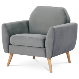 Křeslo, potah šedostříbrná sametová matná látka, plastové nohy, dekor buk