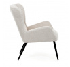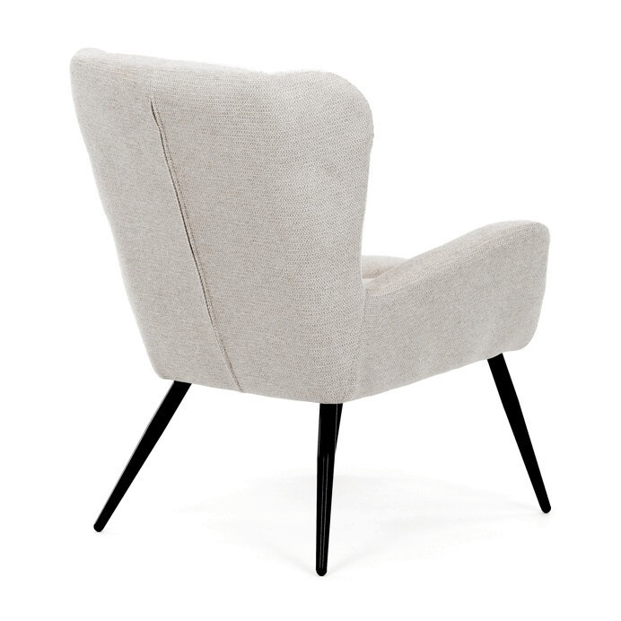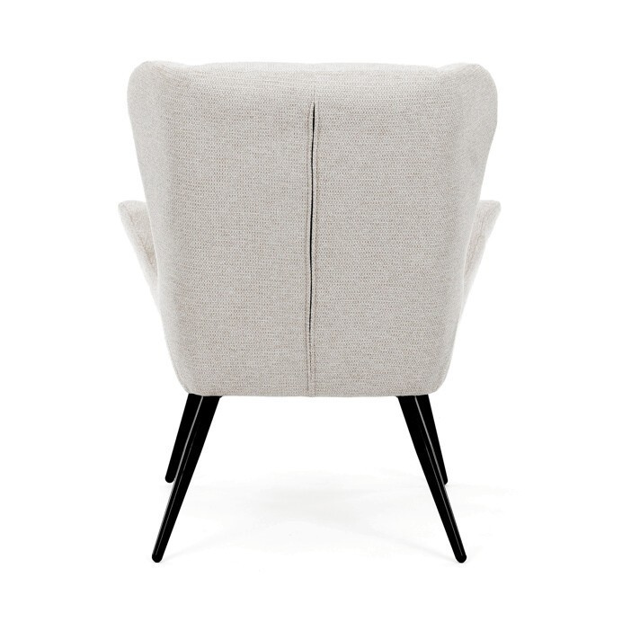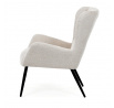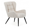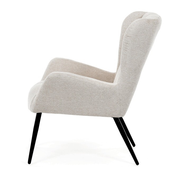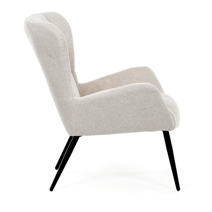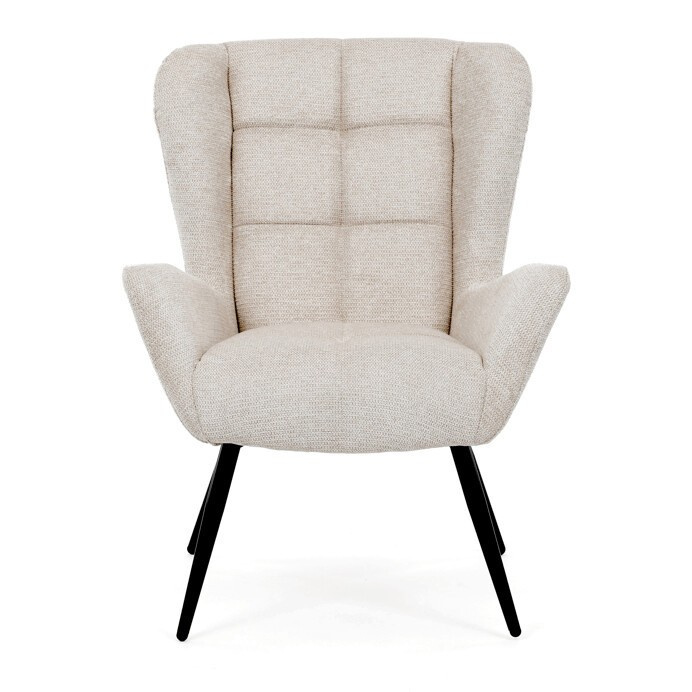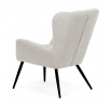 Křeslo ušák v krémovém odstínu nabízí pohodlí díky vysokému polstrování sedáku i opěradla, které je potažené prémiovou látkou s příjemnou texturou. Pevné černé kovové nohy zajišťují stabilitu a dlouhou životnost, zatímco integrované područky přispívají k ergonomickému posedění. Design s charakteristickými vysokými bočními opěrkami poskytuje oporu hlavy a ramenům, což zvyšuje komfort při odpočinku. Křeslo je vhodné do moderních i klasických interiérů, kde vynikne svým nadčasovým tvarem a neutrálním barevným provedením.