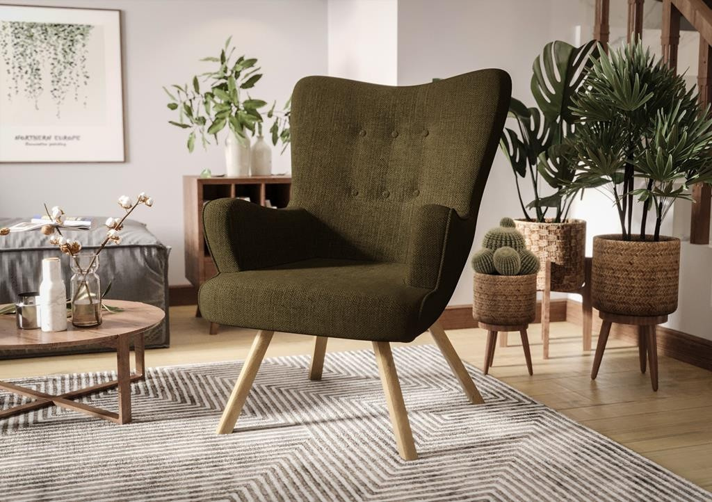 Mimořádně pohodlné křeslo ušák Flori na dřevěných nožkách. Komfortní křeslo má profilované opěradlo. Vyrobíme ho pro tebe v jakékoli barevné kombinaci, kterou si můžeš vybrat z dostupných látek. Vyberte křeslo od výrobce. Vyberte Nábytek Górecki.