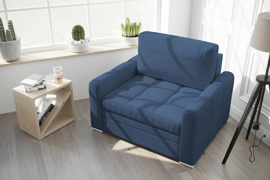 KŘESLO VERONA 105 CM - rychlé odeslání Hledáte ideální nábytek pro relaxaci a odpočinek? Toto křeslo Verona 105 cm - Vaše dokonalé místo pro chvíli odpočinku! Poskytující nejen pohodlí, ale také styl, toto elegantní křeslo dokonale zapadá do každého interiéru. Díky možnosti rozkládání se Verona 105 cm snadno promění z místa k sezení na pohodlnou postel, ideální jak pro každodenní použití, tak pro hosty na noc. Jeho kompaktní rozměr z něj činí ideální volbu pro místnosti s omezeným prostorem, přičemž si zachovává vysoký komfort používání. Vyrobený z vysoce kvalitních materiálů, zaručuje trvanlivost a snadnou údržbu čistoty. Přeměňte svůj interiér v oázu relaxace. Pomůže ti v tom rozkládací křeslo Verona 105 cm - vyber si eleganci a funkčnost již dnes! Model Verona je jedním z našich nejpopulárnějších kusů nábytku mezi zákazníky. Jak těch internetových, tak těch, kteří navštěvují náš kamenný obchod s nábytkem. Všechny prvky byly obšity silným švem, což tvoří ozdobu a zpevňuje spojení tkanin. Na sedácích používáme pěnu s vysokou hustotou (T35), díky čemuž jsou mimořádně odolné proti deformacím a budou ti sloužit po dlouhá léta!Tvrdost sedadel v našich pohovkách typu americká pohovka označujeme jako středně tvrdou. Tento nábytek může být u tebe už do 14 dnů. dny. Křeslo Verona je k dispozici s možností rychlého odeslání. Křeslo vyrobené z látky v odstínu modré barvy.
