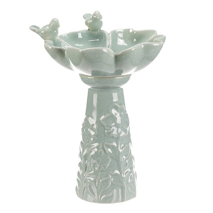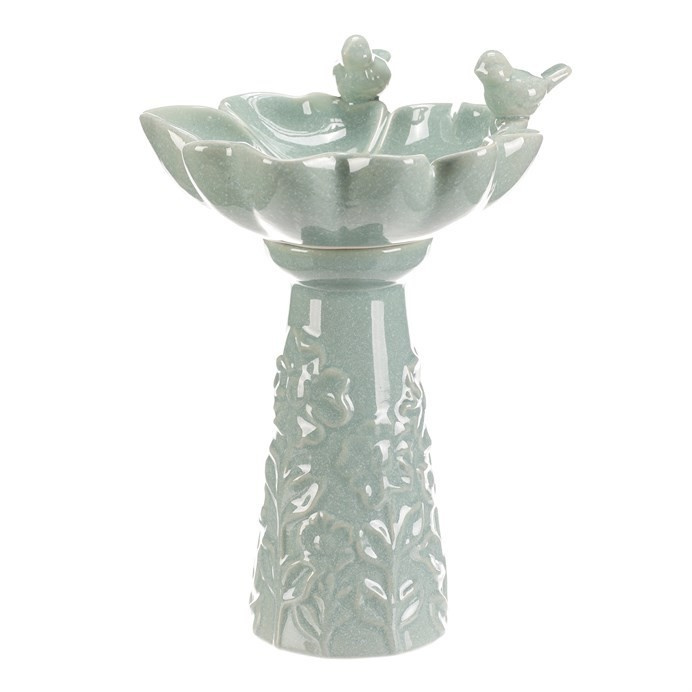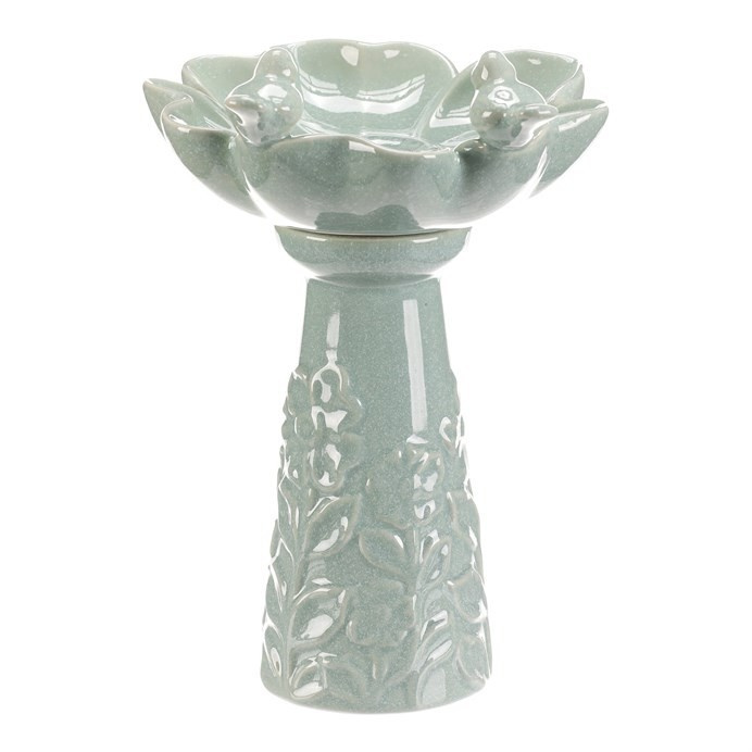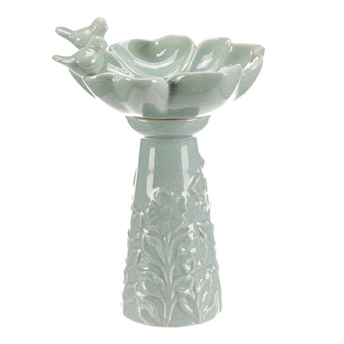 Keramické krmítko a pítko v mentolovém odstínu je navrženo jako dekorativní doplněk do zahrady či na terasu. Tvar květu s jemně modelovanými okvětními lístky doplňují dvě malé figurky ptáčků, které přidávají na vizuálním efektu a přirozenosti. Povrch je hladký s jemnou glazurou, která usnadňuje údržbu. Stabilní stojatá forma zajišťuje bezpečné umístění na rovné ploše. Vhodné jako zdroj vody nebo krmivo pro ptactvo v exteriéru i interiéru.