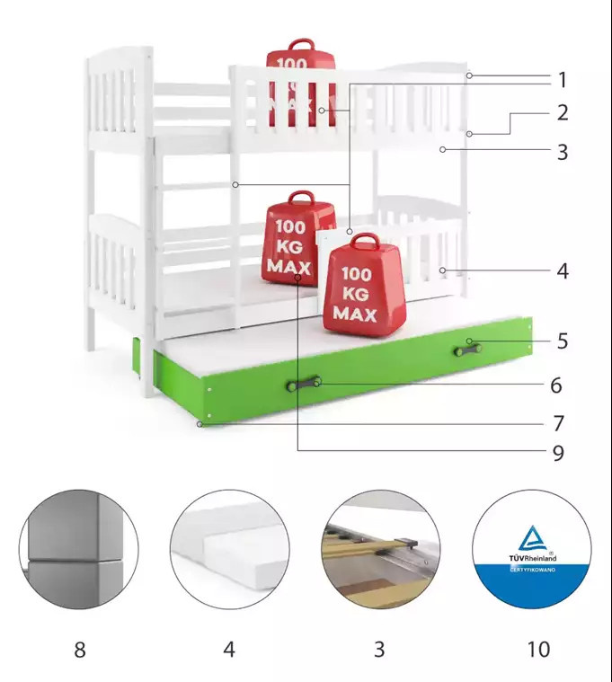 Dětská patrová postel KUBUS 3 s přistýlkou 90x200 cm, včetně matrací, Bílá/Zelená