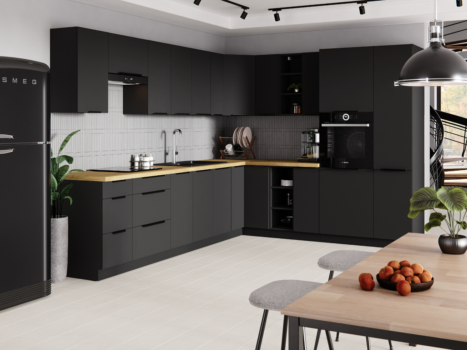 - Dvířka a čela šuplíků jsou vyrobeny z LTD desky výšky 16 mm v barvě Černá mat