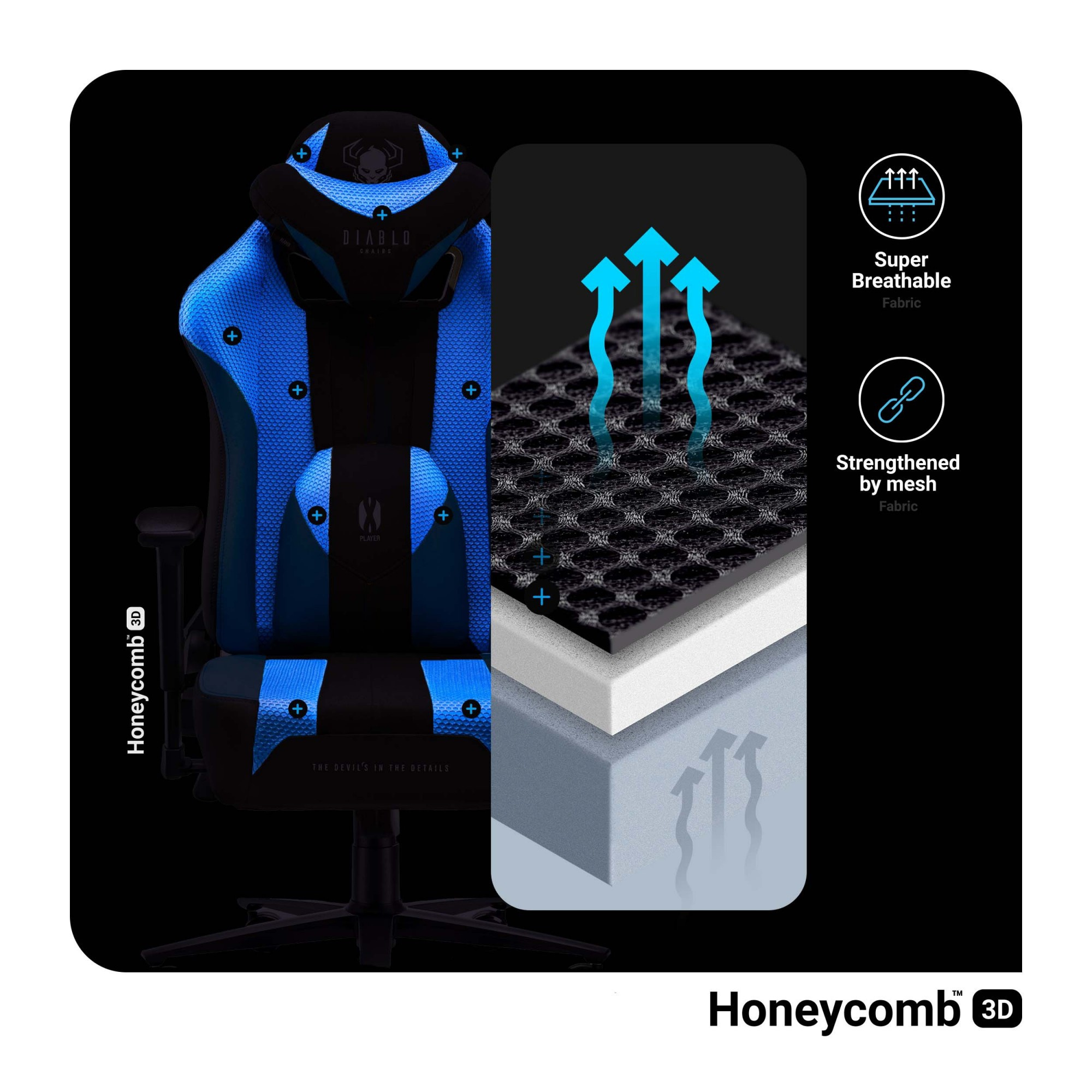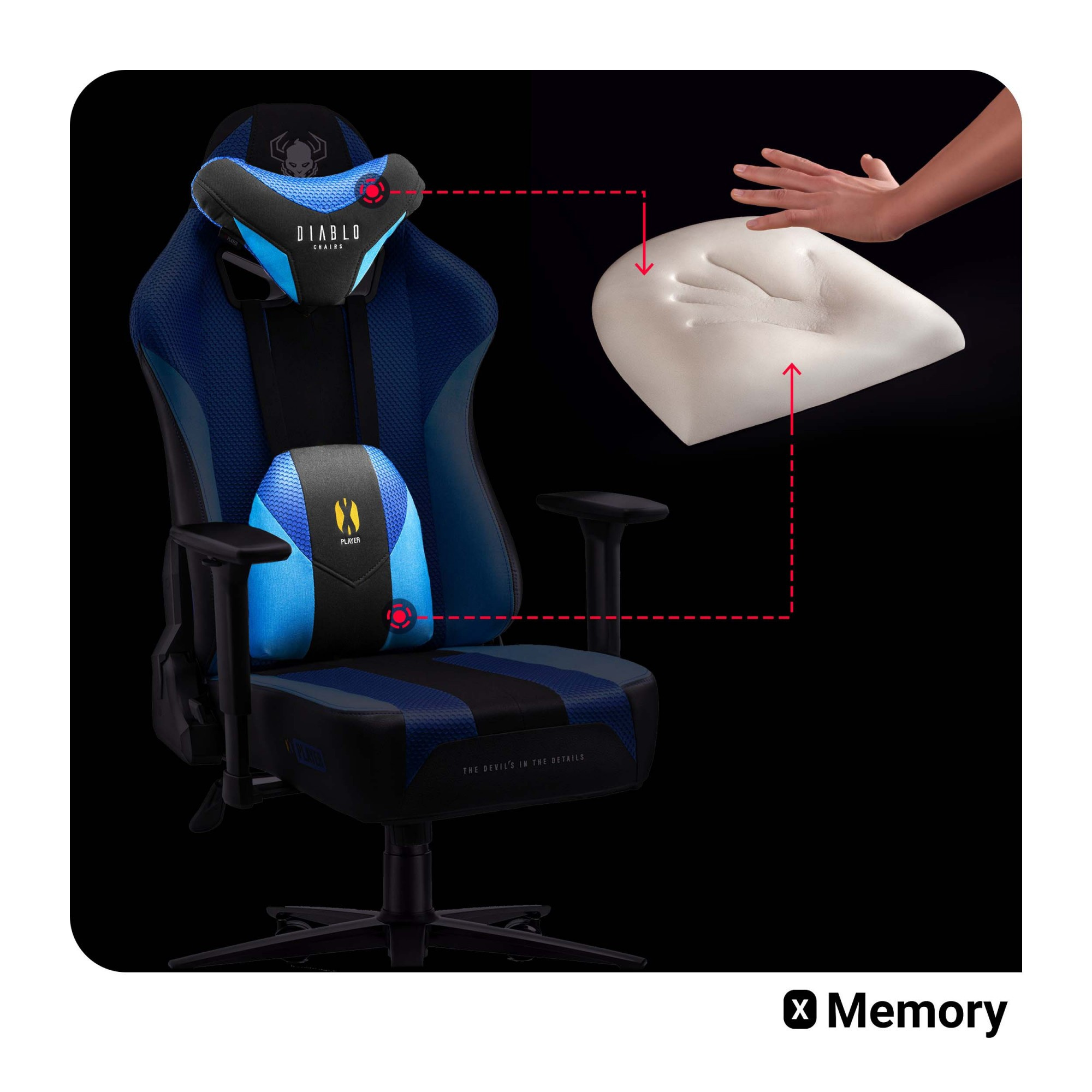 Textilní herní křeslo DIABLO X-PLAYER 2.0: FROST BLACK: KING SIZE Komfort a bezpečnost během hry jsou stejně důležité jako správné vybavení a herní příslušenství. Aby dbát o ergonomii a učinit virtuální zápolení ještě příjemnějším, nezapomeň vybavit svůj setup herním křeslem Diablo X-Player ve verzi Frost Black – model, který dokonale spojuje ergonomická technická řešení s výrazným designem. PODPORA DRŽENÍ TĚLA Pro pohodlnou a bezpečnou práci, učení nebo zábavu je nezbytná ergonomická podpora držení těla. Právě proto náš Herní křeslo získalo dva měkké, dokonale tvarované polštáře, které zajistí vašim zádům správné nastavení a ochrání je před mnoha negativními důsledky dlouhodobého sezení. Bederní polštář podepře dolní část zad a opěrka hlavy – krční část páteře. Polštáře zabrání škodlivému naklánění do nesprávné polohy a budou účinně stabilizovat postavu, čímž ti zaručí maximální pohodlí a plnou bezpečnost. S X-Playerem je ergonomická pozice také mimořádně pohodlná. Polštáře opěradla jsou vyplněny měkkou a pružnou pěnou Memory, která se přizpůsobuje tvaru zad. Bezpečná pozice je díky tomu přirozená a pohodlná. MATERIÁLOVÉ ČALOUNĚNÍ Pohodlí za všech podmínek, i během hraní, učení nebo práce v obzvláště teplých dnech, vám zajistí příjemné na dotek čalounění z tkaniny EcoFiber™ a síťoviny Diablo Honeycomb™. Odolnost použitých tkanin, jejich odolnost proti oděru a silné švy Nylon™ LV3 zajišťují čalounění vynikající vzhled po mnoho let. Čalounění jsme podšili odolnou HR pěnou, která ti zaručí mimořádně pohodlnou a měkkou polohu, a křeslu perfektní vzhled na léta. Sedák Dual Layer™ je vyplněn zvětšeným množstvím pěny, což znamená ještě více pohodlí. BALÍČEK REGULACÍ Zárukou pohodlné polohy je správné přizpůsobení křesla postavě, proto je X-Player vybaven řadou praktických regulačních mechanismů. Spolehlivý systém Tilttech™ Butterfly ti umožní rychle a snadno přesně nastavit výšku sedadla, zatímco praktická páka mechanismu Tilttech™ Gear ti umožní přizpůsobit vhodný úhel sklonu opěradla. Navíc získáte možnost příjemného a relaxačního houpání se systémem Tilttech™ Swing. Měkkou a stabilní oporu pro ruce zajišťují područky Armtech™ Hybrid SoftTouch s nastavením ve třech rovinách. Odlehčí a podpoří tvá ramena, předloktí a zápěstí, poskytnou ti dodatečný komfort a stabilizují postavu. SPOLEHLIVÝ ZÁKLAD Bezpečnost není jen správná poloha a vhodné nastavení páteře, ale také stabilita. Aby tě chránila před pádem, i během těch nejintenzivnějších pohybů a houpání, vybavili jsme naši herní židli silnou základnou. Zakončují ji navíc gumová kolečka PFC™ 360, která chrání podlahu před poškrábáním a zajišťují potřebnou mobilitu. Odpovídající odpružení zajišťuje mechanismus Air Damper™ System, díky kterému se X-Player přizpůsobí každému pohybu vaší postavy. Zvolili jsme výrazný design, za kterým se skrývá řada spolehlivých regulací a ergonomická konstrukce. Masivní silueta křesla, černo-modré čalounění a charakteristická loga jsou teprve začátek, protože naše Herní křeslo přináší emoce, komfort a dodatečné potěšení z každé hry.