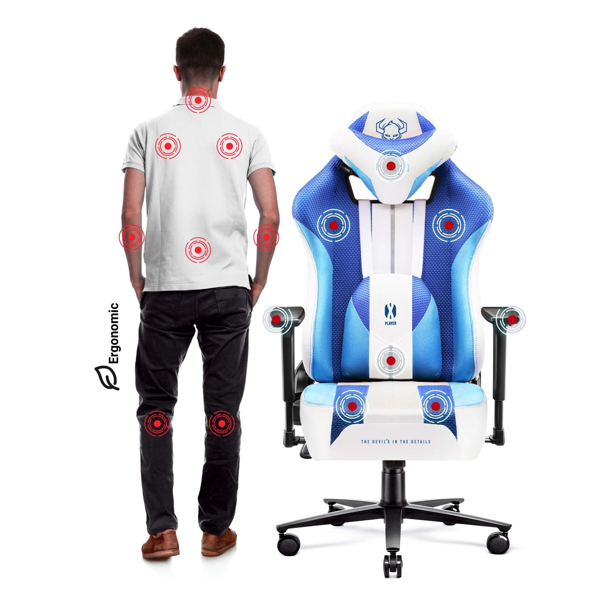 Textilní herní křeslo DIABLO X-PLAYER 2.0 FROST WHITE: NORMÁLNÍ VELIKOST Toto je herní křeslo, které ti poskytne spoustu dalších zážitků z každé hry. Diablo X-Player v zcela nové, bílo-modré verzi Frost White je nezbytnou součástí herního setupu, protože díky němu se každá hra stane ještě více vzrušující. Masivní silueta, hypnotizující loga a příjemné na dotek, látkové čalounění způsobí, že naše Herní křeslo naplní váš pokoj nebo kancelář jedinečnou atmosférou. Bude také nepostradatelnou podporou, protože byl navržen s ohledem na ochranu držení těla a zajištění před negativními důsledky dlouhodobého pobytu v sedící poloze. Poznej podrobnosti! PODPORA POSTAVY Aby bylo možné účinně pečovat o vaši postavu a řádně chránit páteř po celé její délce, vybavili jsme model X-Player měkkým bederním polštářem a opěrkou hlavy. Díky ergonomickým tvarům podpoří vaši páteř a zajistí vám bezpečnou a pohodlnou polohu při každém opření zad. Vyhneš se následkům dlouhodobého sezení, především bolesti nebo vzniku či prohlubování vad držení těla. NEJVYŠŠÍ KVALITA MATERIÁLŮ Masivní siluetu modelu X-Player obepíná odolné vlákno EcoFiber™ a síťovina Diablo Honeycomb™ s prodyšnou strukturou včelí plástve. Tyto spolehlivé tkaniny zaručují nezbytnou cirkulaci vzduchu a jejich odolnost proti oděru a poškození je zárukou, že se budou po mnoho let prezentovat dokonale. Boční část sedáku a zadní část opěradla pokrývá hladká ekokůže HDS™, která se výrazně prezentuje v každém herním setupu. Navíc silné švy Nylon™ LV3 zajistí čalounění správné napětí. Materiály jsme podšili měkkou a odolnou proti deformacím pěnou HR, díky které získáte pohodlnou pozici a vaše Herní křeslo zůstane po dlouhá léta bez deformací. BALÍČEK REGULACÍ S područkami Armtech™ Hybrid SoftTouch získáte ještě pohodlnější polohu, protože jejich umístění přizpůsobíte své postavě ve třech směrech. Díky správné regulaci získáte nezbytný komfort při každém opření rukou, stabilní pozici a ergonomickou podporu pro zápěstí, předloktí a ramena. Regulaci výšky křesla vzhledem k tvé postavě a výšce umožňuje systém Tilttech™ Butterfly. Správné nastavení zaručuje pohodlnou polohu a usnadňuje přirozené přizpůsobení se opěrce hlavy a bedernímu polštáři. Díky mechanismu Tilttech™ Swing získáte jedinečnou funkci bezpečného a relaxačního houpání a systém Tilttech™ Gear vám umožní nastavit nejpohodlnější úhel sklonu opěradla. ODOLNÁ ZÁKLADNA Silné a přesně spojené materiály, které tvoří pětiramennou základnu modelu X-Player, zaručují jistou a stabilní polohu, i během intenzivních pohybů. Navíc mechanismus zvedáku Air Damper™ System zajistí, že získáte správné odpružení, a tedy ještě více pohodlí. Kolečka PFC™360 zajišťují křeslu mobilitu na každém povrchu a díky jejich kaučukovému povrchu bude podlaha dokonale chráněna před poškrábáním. Množství nadšení, spousta komfortu a nezbytná bezpečnost na dlouhá léta. Diablo X-Player ve verzi Frost White je herní křeslo, se kterým se herní zážitky stanou výjimečnými jako nikdy předtím, interiér pokoje získá jedinečný charakter a vaše držení těla získá nenahraditelnou podporu.