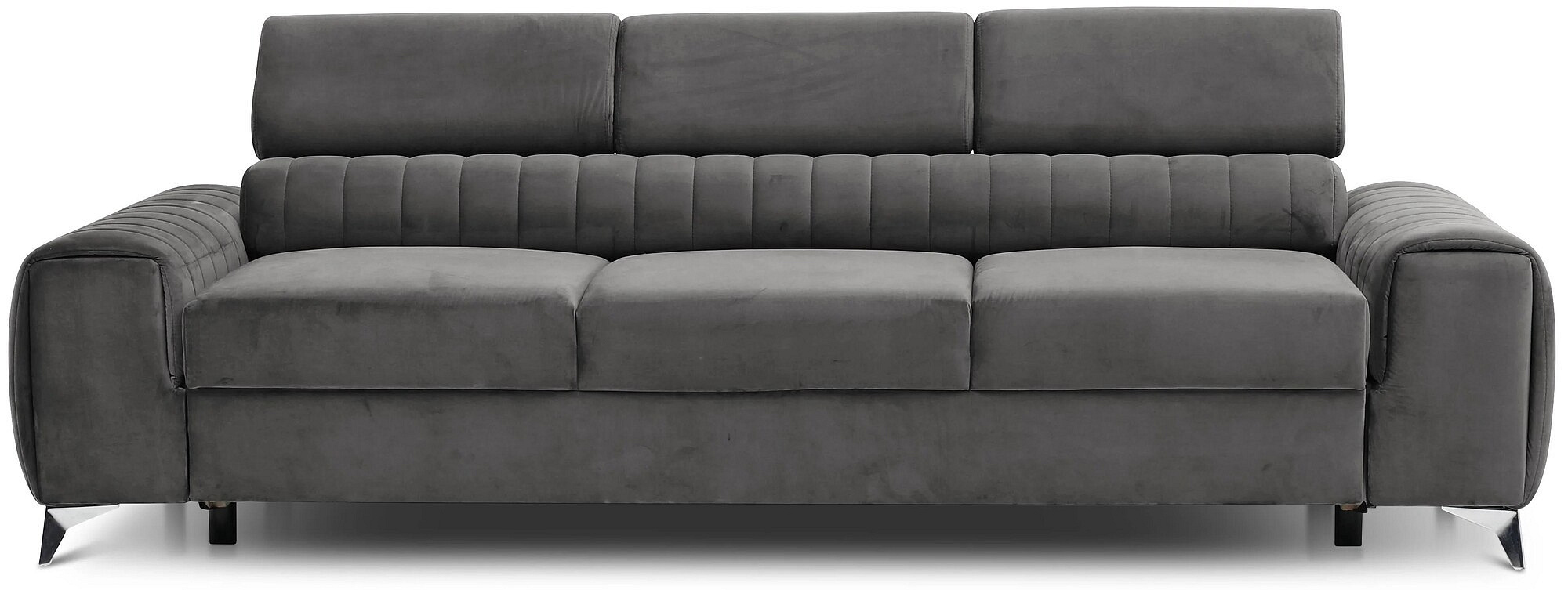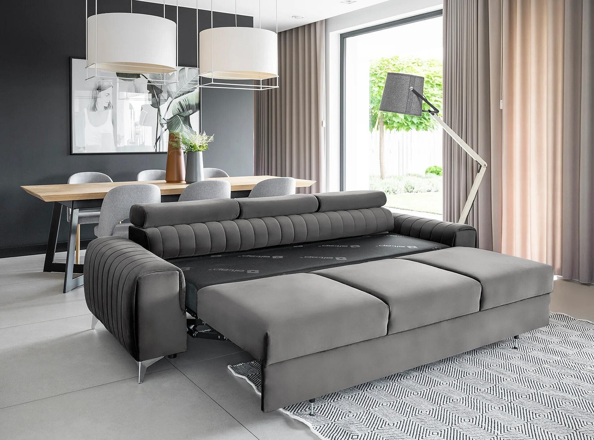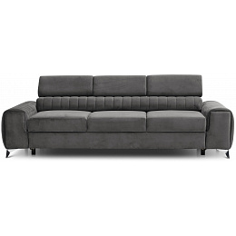 Pohovka Laurence má pevný dřevěný rám, který spočívá na šikmých, chromovaných kovových nohách. Tato rozkládací pohovka, obalená v elegantních látkách z kolekce ELTAP, má sedák vyplněný pěnami HR a T30. Kromě toho je kus nábytku podepřen pevnými vlnovými pružinami typu B, které poskytují pocit pohodlí a komfortu. Pohovka Laurence přináší lehkost a styl do interiéru. Klasický tvar tohoto kusu nábytku je v kontrastu s prošíváním a jasně zdůrazněným rozdělením na tři sedací plochy. Pohovka Laurence je ideální volbou pro menší místnosti, kam například nemůžete umístit rohovou sedací soupravu. Jeho rozměry jsou: 260 x 97 x 75 centimetrů. Výška jeho nohou (10 cm) vám umožňuje čistit podlahu pod gaučem pomocí moderních čisticích robotů. Tato rozkládací pohovka se může také proměnit v dvoulůžko, což je ideální pro přeměnu jakéhokoli interiéru na pokoj pro hosty. Systém puma plus byl použit jako mechanismus rozkládání pohovky, který vyžaduje zvednutí sedadla a jeho sklopení dopředu. Současně se automaticky vysune druhá spací plocha zpod sedadla. Výhodou mechanismu puma plus je, že se nemusíte obávat poškození podlahy při rozkládání a skládání pohovky. Celá konstrukce je velmi lehká a jednoduchá, takže ji kdokoliv může bez problémů rozložit. Spací plocha o rozměrech 199 x 136 centimetrů poskytuje klidný spánek pro dvě osoby.