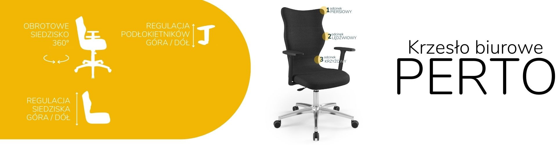 Moderní židle Perto Black je praktické a elegantní řešení přizpůsobené potřebám moderní kanceláře. Při dlouhé práci vsedě jsou velmi důležité správné podmínky. Optimální držení těla je naprosto zásadní, ale důležité jsou také otázky, jako je vzdálenost od monitoru a časté změny polohy. Kancelářská židle Perto s leštěnou podnoží, kterou nabízíme, vám umožní efektivně se postarat o všechny tři aspekty najednou. Tím se zvyšuje naše výkonnost a výrazně se snižují negativní účinky sedavého zaměstnání. Kancelářská židle na kolečkách také řeší organizační problémy spojené s uspořádáním a změnou uspořádání prostoru v kanceláři. Můžeme je snadno přemístit nebo přesunout do nižšího či vyššího patra. Nebude nás to stát příliš mnoho úsilí, protože námi navržená leštěná kancelářská židle je velmi lehká.
