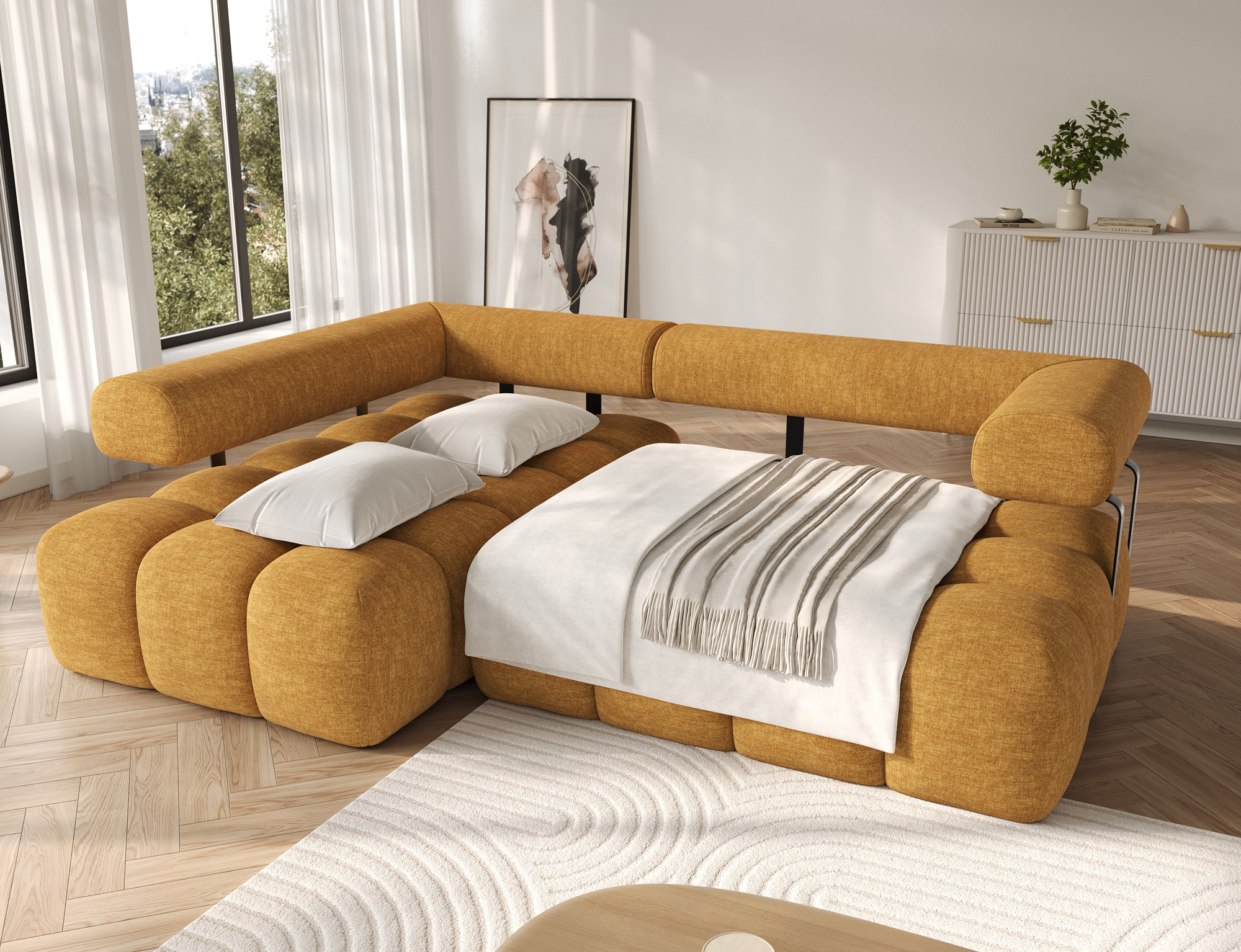 Jednou z hlavních předností této sedací soupravy je její rozkládací funkce. Snadno ji přeměníte na pohodlné lůžko s plochou na spaní 110 x 187 cm, což je ideální pro nečekané hosty nebo pro ty, kteří si rádi dopřejí odpolední siestu. Díky této funkci se stává skvělou volbou pro menší byty, kde je třeba efektivně využít každý centimetr prostoru.