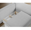 Livosa corner sofa is a modern L-shaped sofa with sleeping function that combines everyday comfort with practical living room solutions. The ergonomic seat and backrest, filled with B-type wave springs and T2540 polyurethane foam, provide excellent support, durability, and comfort. The sofa features a DL unfolding mechanism, allowing quick and easy conversion into a sleeping surface measuring 125 × 220 × 48 cm, making it ideal as a sofa bed. An additional advantage is the bedding storage compartment measuring 50 × 104 × 24 cm. The design is completed with decorative cushions filled with foam granules, low black legs with a height of 3 cm, and a solid construction with overall dimensions of 220 × 144 × 93 cm, making Livosa a perfect fit for modern interiors.