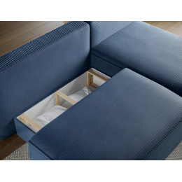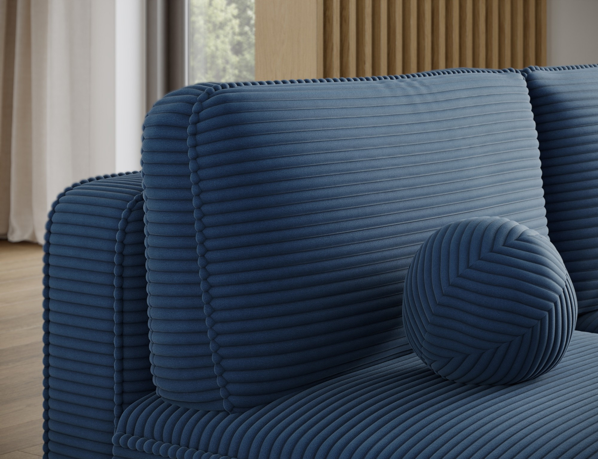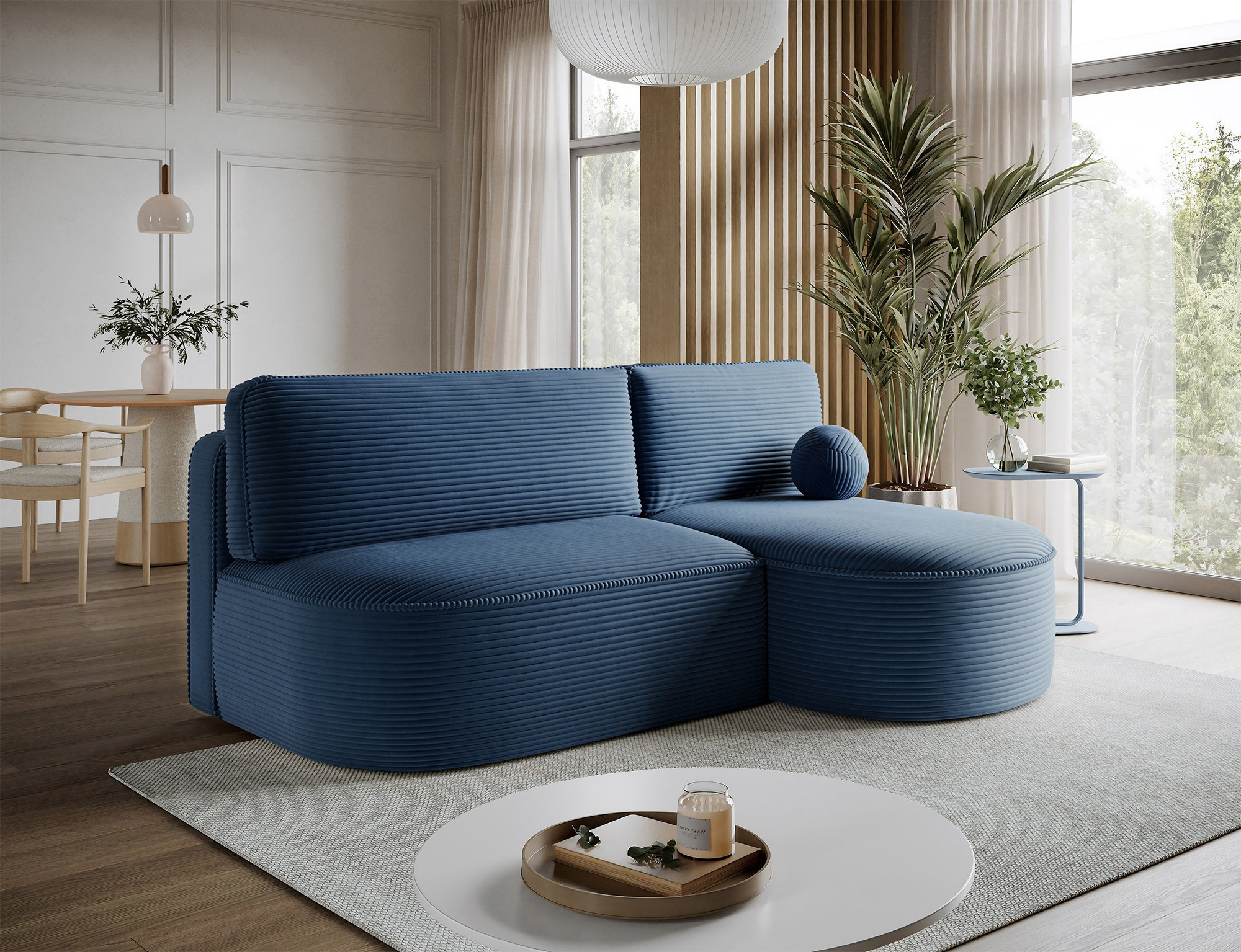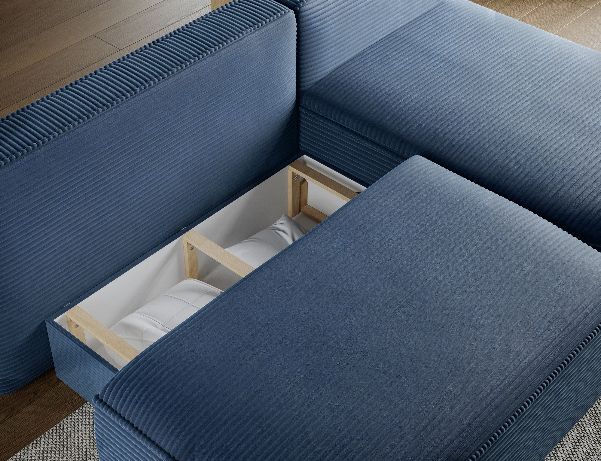 Livosa corner sofa is a modern L-shaped sofa with sleeping function that combines everyday comfort with practical living room solutions. The ergonomic seat and backrest, filled with B-type wave springs and T2540 polyurethane foam, provide excellent support, durability, and comfort. The sofa features a DL unfolding mechanism, allowing quick and easy conversion into a sleeping surface measuring 125 × 220 × 48 cm, making it ideal as a sofa bed. An additional advantage is the bedding storage compartment measuring 50 × 104 × 24 cm. The design is completed with decorative cushions filled with foam granules, low black legs with a height of 3 cm, and a solid construction with overall dimensions of 220 × 144 × 93 cm, making Livosa a perfect fit for modern interiors.