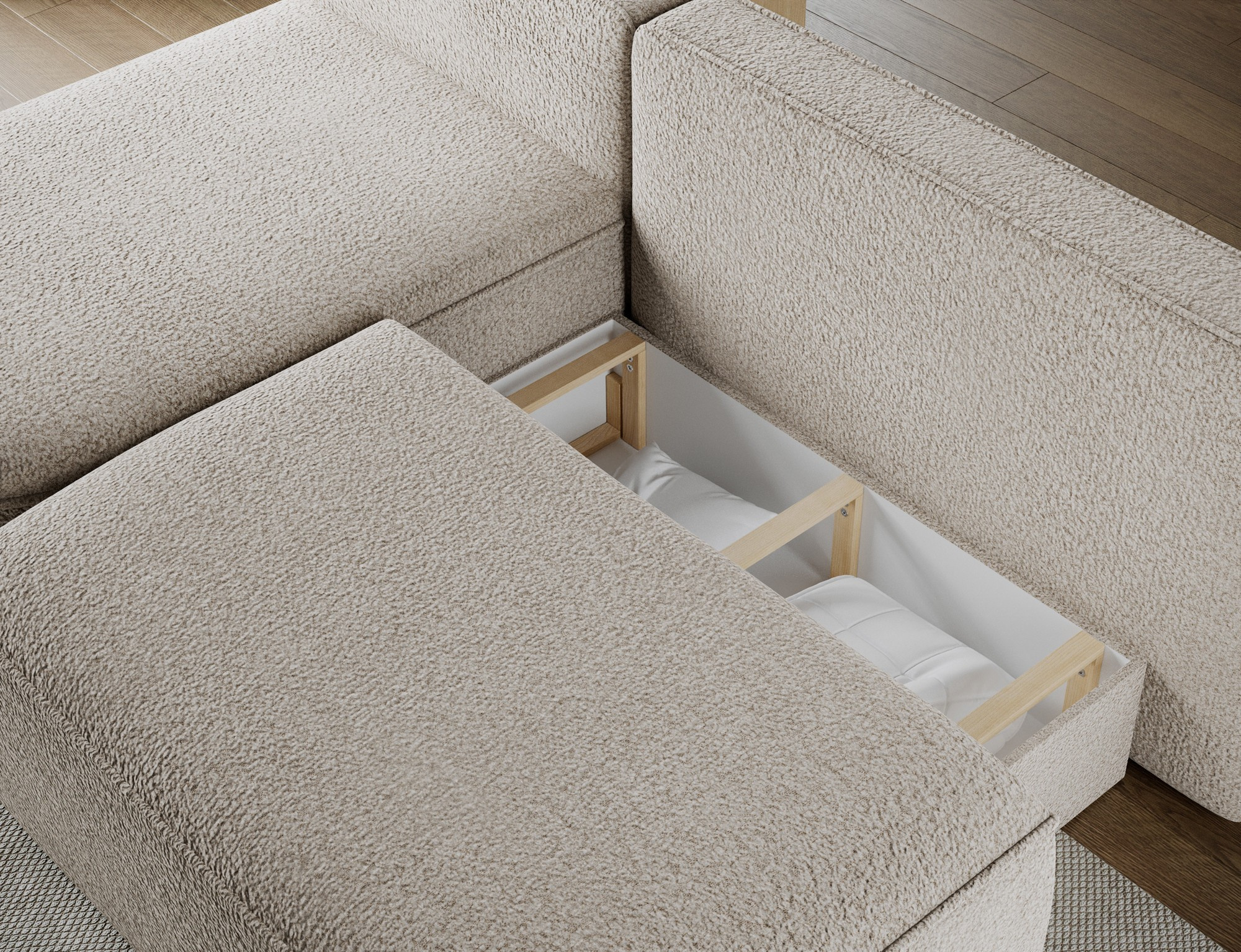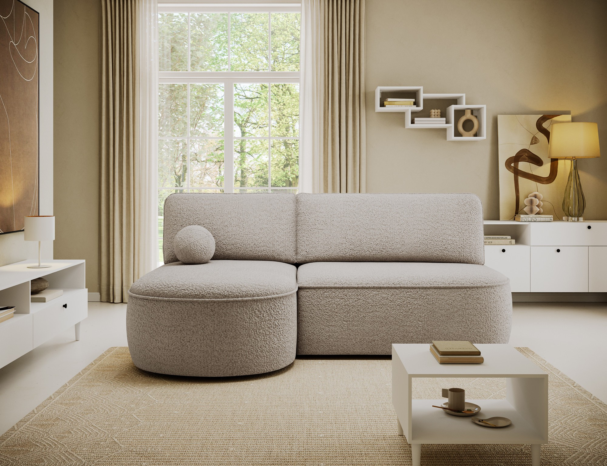 Livosa corner sofa is a modern L-shaped sofa with sleeping function that combines everyday comfort with practical living room solutions. The ergonomic seat and backrest, filled with B-type wave springs and T2540 polyurethane foam, provide excellent support, durability, and comfort. The sofa features a DL unfolding mechanism, allowing quick and easy conversion into a sleeping surface measuring 125 × 220 × 48 cm, making it ideal as a sofa bed. An additional advantage is the bedding storage compartment measuring 50 × 104 × 24 cm. The design is completed with decorative cushions filled with foam granules, low black legs with a height of 3 cm, and a solid construction with overall dimensions of 220 × 144 × 93 cm, making Livosa a perfect fit for modern interiors.