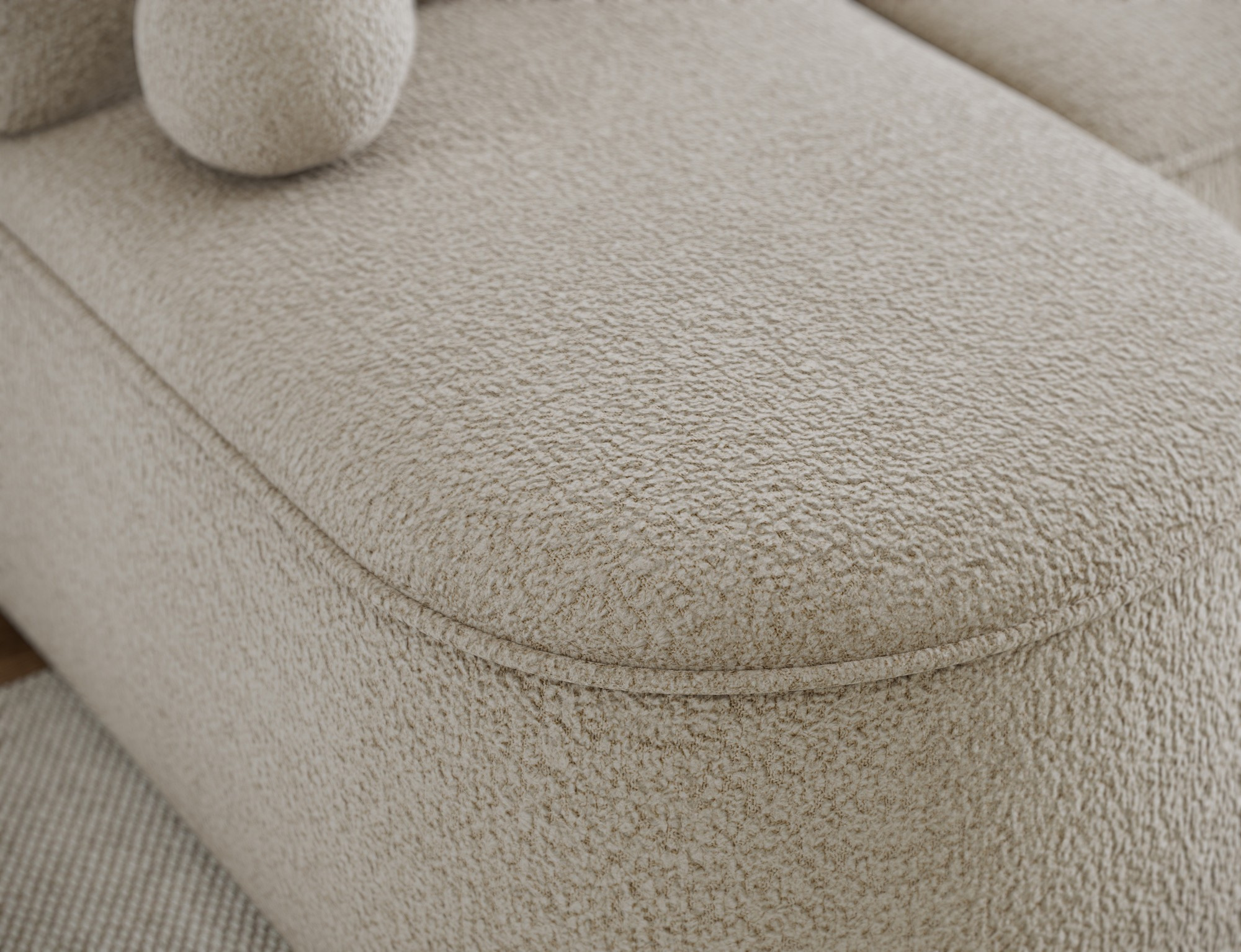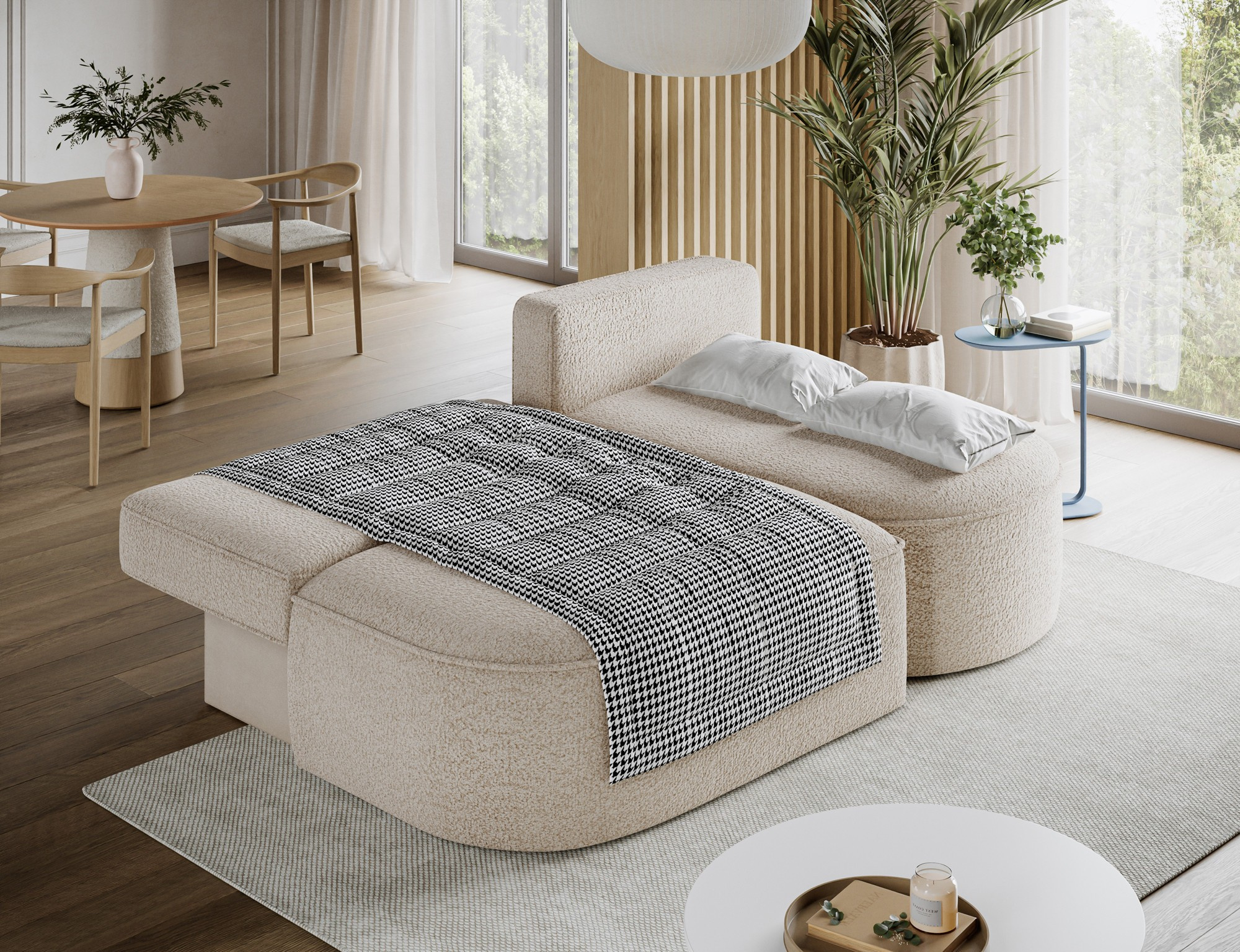 Livosa corner sofa is a modern L-shaped sofa with sleeping function that combines everyday comfort with practical living room solutions. The ergonomic seat and backrest, filled with B-type wave springs and T2540 polyurethane foam, provide excellent support, durability, and comfort. The sofa features a DL unfolding mechanism, allowing quick and easy conversion into a sleeping surface measuring 125 × 220 × 48 cm, making it ideal as a sofa bed. An additional advantage is the bedding storage compartment measuring 50 × 104 × 24 cm. The design is completed with decorative cushions filled with foam granules, low black legs with a height of 3 cm, and a solid construction with overall dimensions of 220 × 144 × 93 cm, making Livosa a perfect fit for modern interiors.