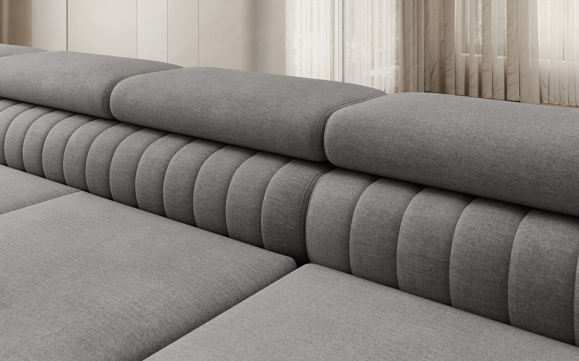 Rohová pohovka Louis je pohodlná, stylová a především funkční. Sedák se skládá z vlnových pružin a výplně z T30 a vysoce pružné HR pěny, která se dokonale přizpůsobí tělu a zvyšuje komfort. Rozměry rohové pohovky Louis — 347 x 202 x 92 cm — dále zvyšují úroveň pohodlí. Mezi jeho výhody patří čtyři nastavitelné opěrky hlavy, úložný prostor na lůžkoviny a velká spací plocha o rozměrech 254 x 123 cm. Kromě toho je mechanismus rozkládání „delfín“ použitý v tomto kusu jednoduchý a intuitivní. Můžete si také vybrat barvu čalounění rohové pohovky Louis z palety látkové kolekce Eltap. Designové nohy pohovky také stojí za zmínku — jsou vyrobeny z oceli, pochromované a vysoké, což dodává nábytku elegantní nádech. Estetické kvality jsou dále zdůrazněny vertikálním prošíváním na boku a zadní části pohovky Louis.