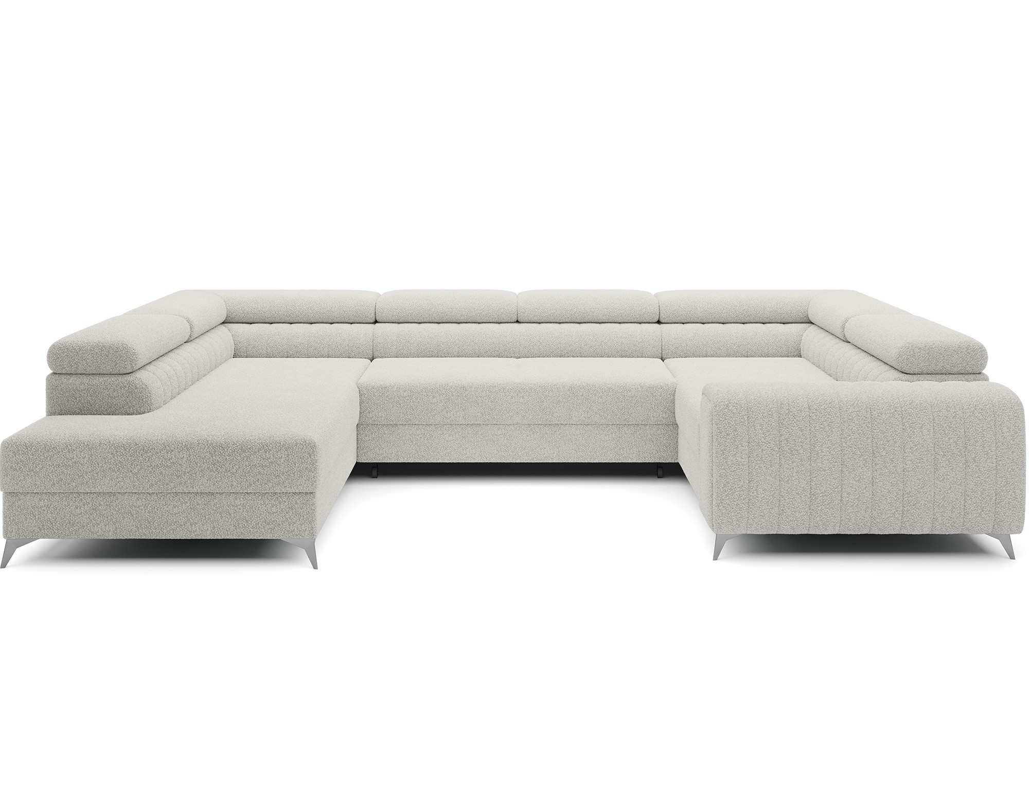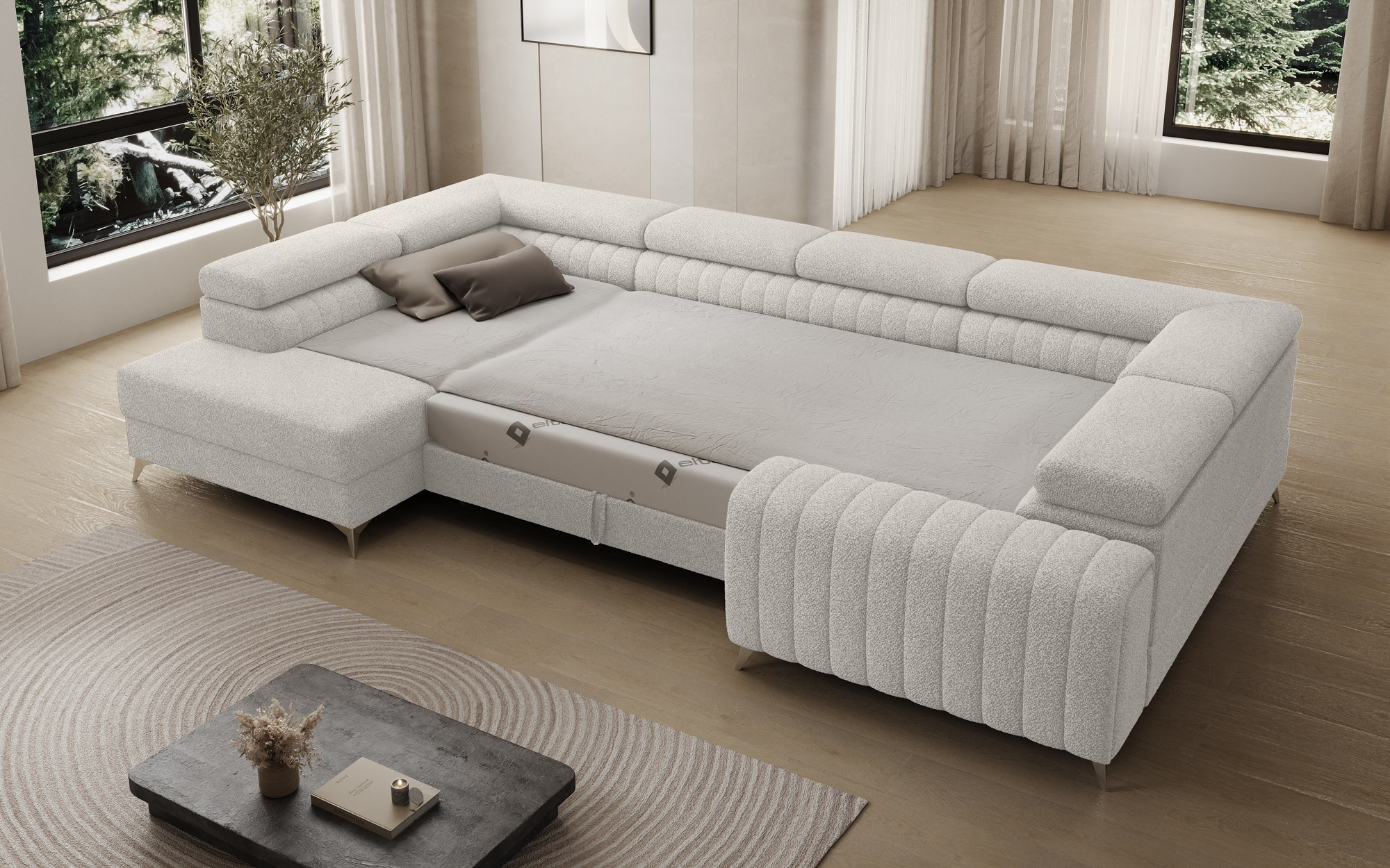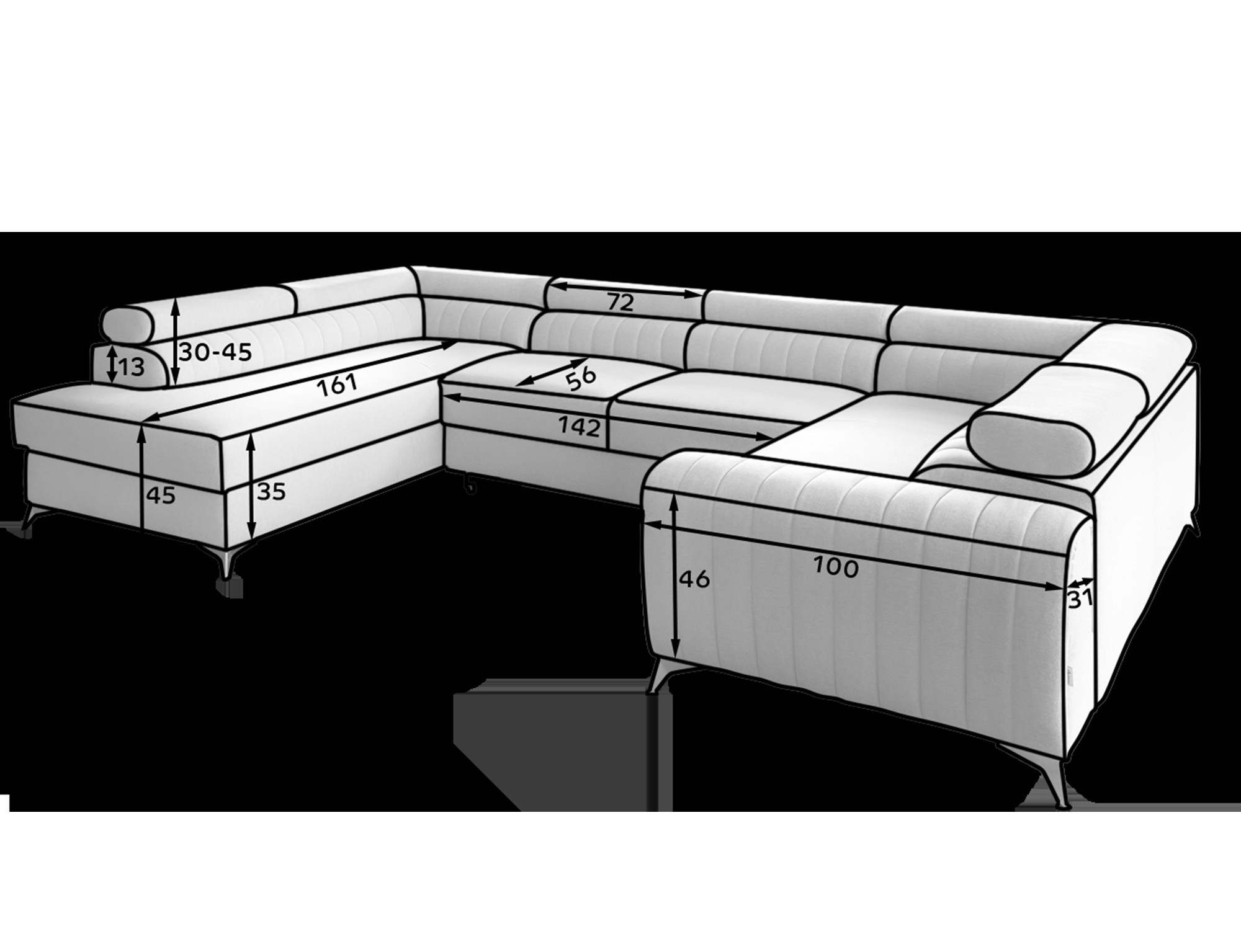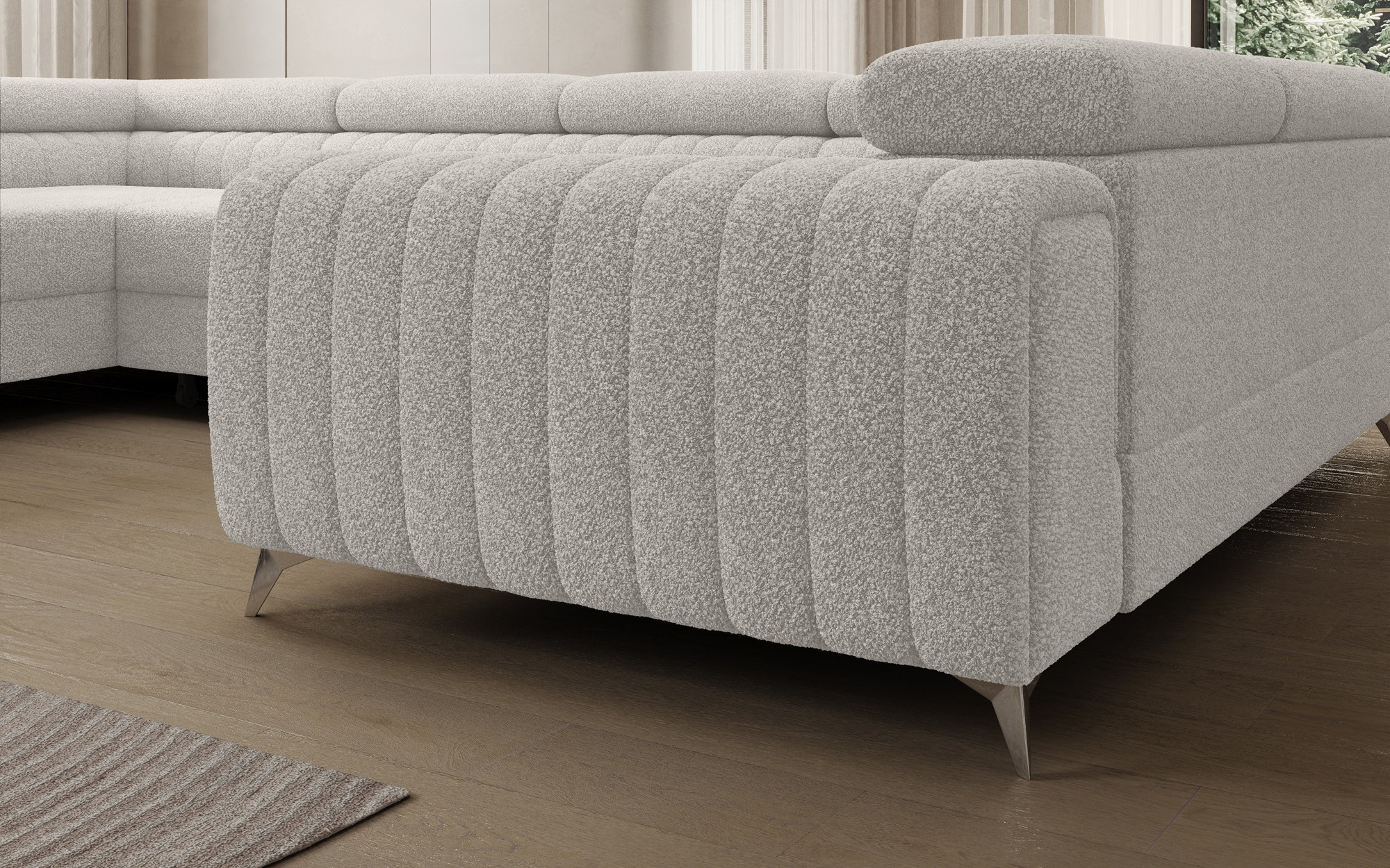 Rohová pohovka Louis je pohodlná, stylová a především funkční. Sedák se skládá z vlnových pružin a výplně z T30 a vysoce pružné HR pěny, která se dokonale přizpůsobí tělu a zvyšuje komfort. Rozměry rohové pohovky Louis — 347 x 202 x 92 cm — dále zvyšují úroveň pohodlí. Mezi jeho výhody patří čtyři nastavitelné opěrky hlavy, úložný prostor na lůžkoviny a velká spací plocha o rozměrech 254 x 123 cm. Kromě toho je mechanismus rozkládání „delfín“ použitý v tomto kusu jednoduchý a intuitivní. Můžete si také vybrat barvu čalounění rohové pohovky Louis z palety látkové kolekce Eltap. Designové nohy pohovky také stojí za zmínku — jsou vyrobeny z oceli, pochromované a vysoké, což dodává nábytku elegantní nádech. Estetické kvality jsou dále zdůrazněny vertikálním prošíváním na boku a zadní části pohovky Louis.