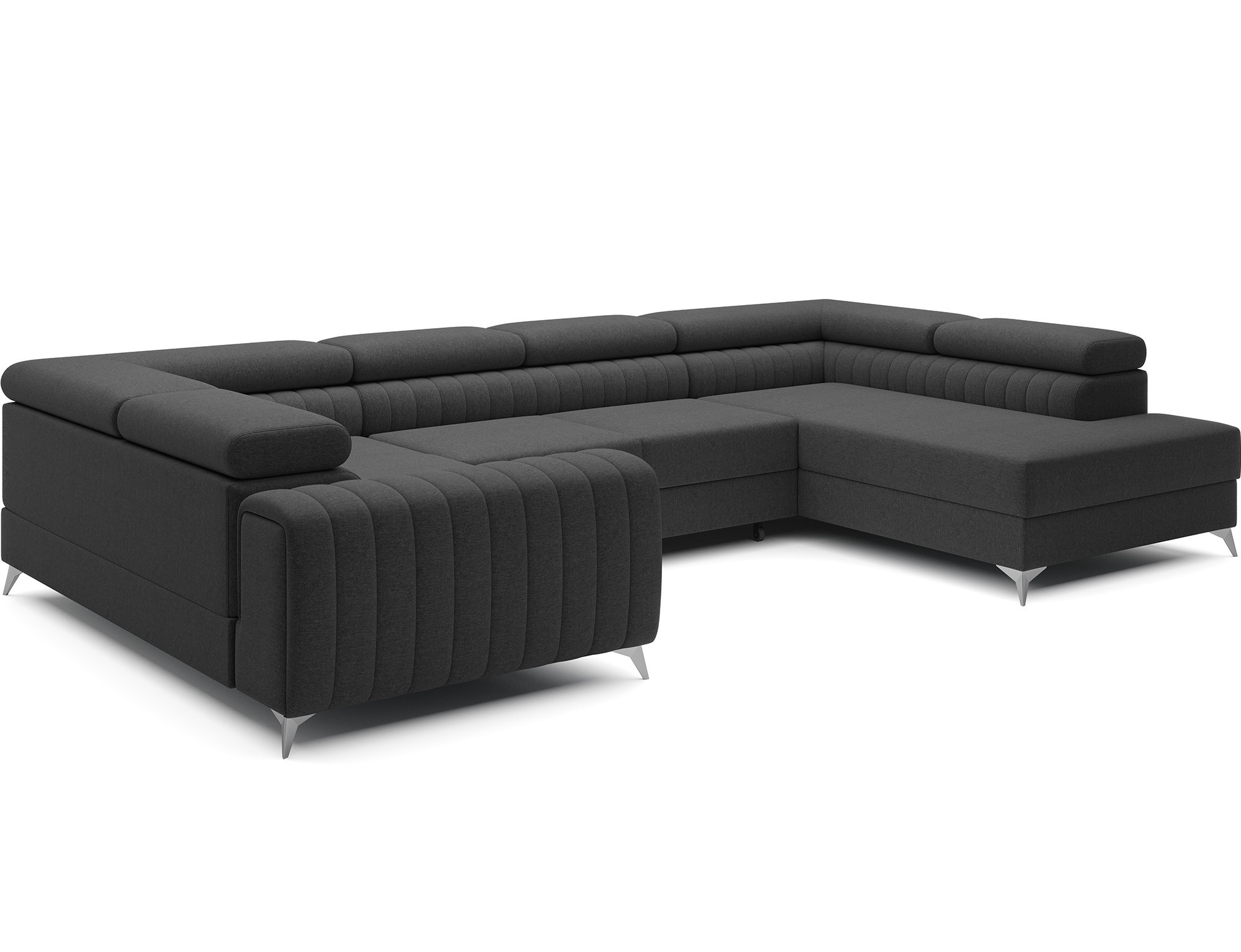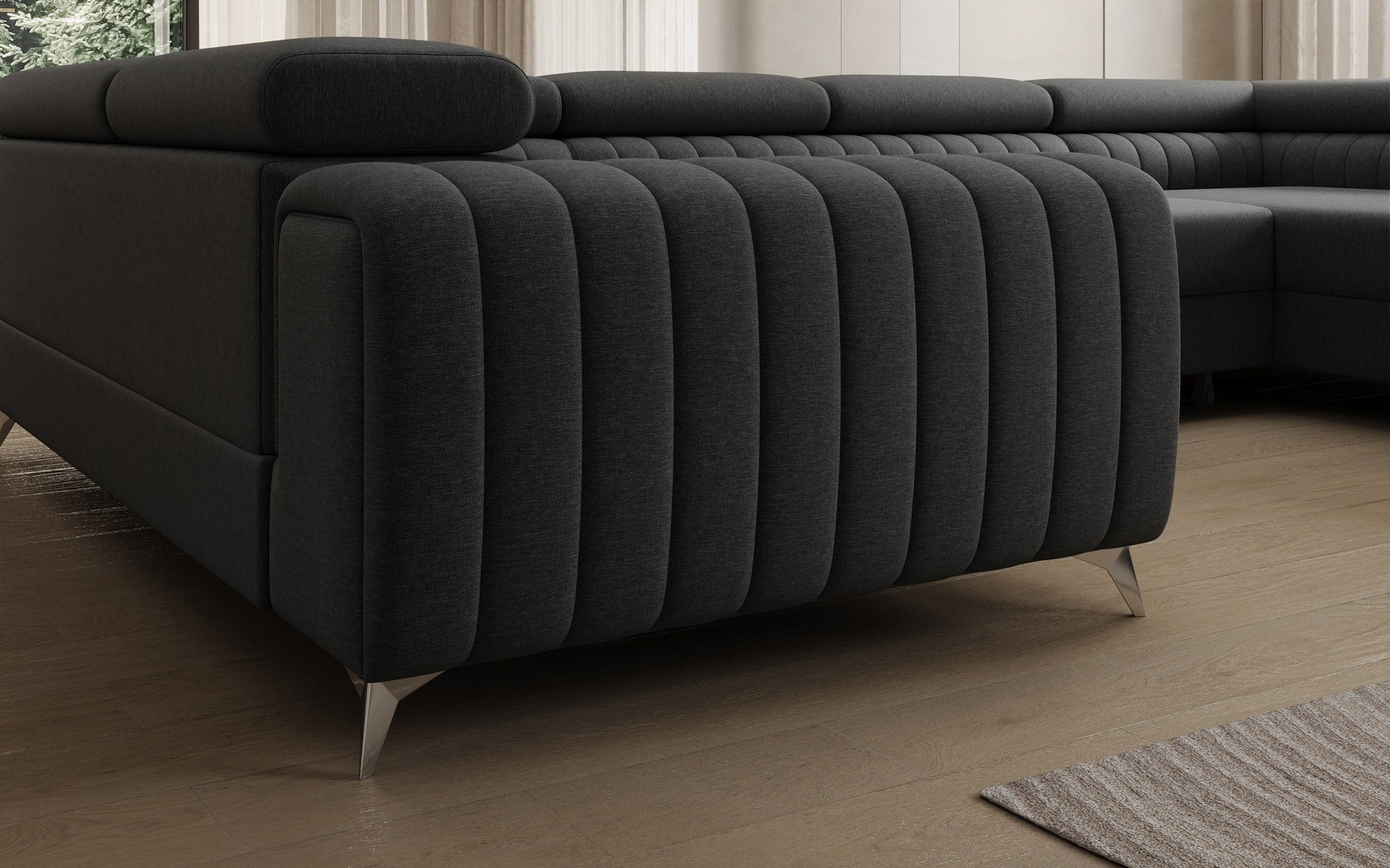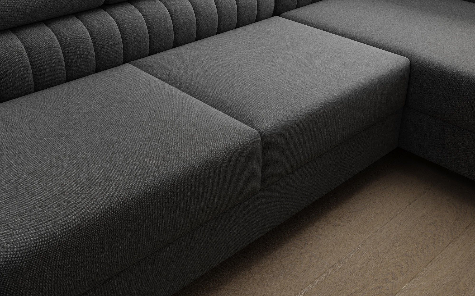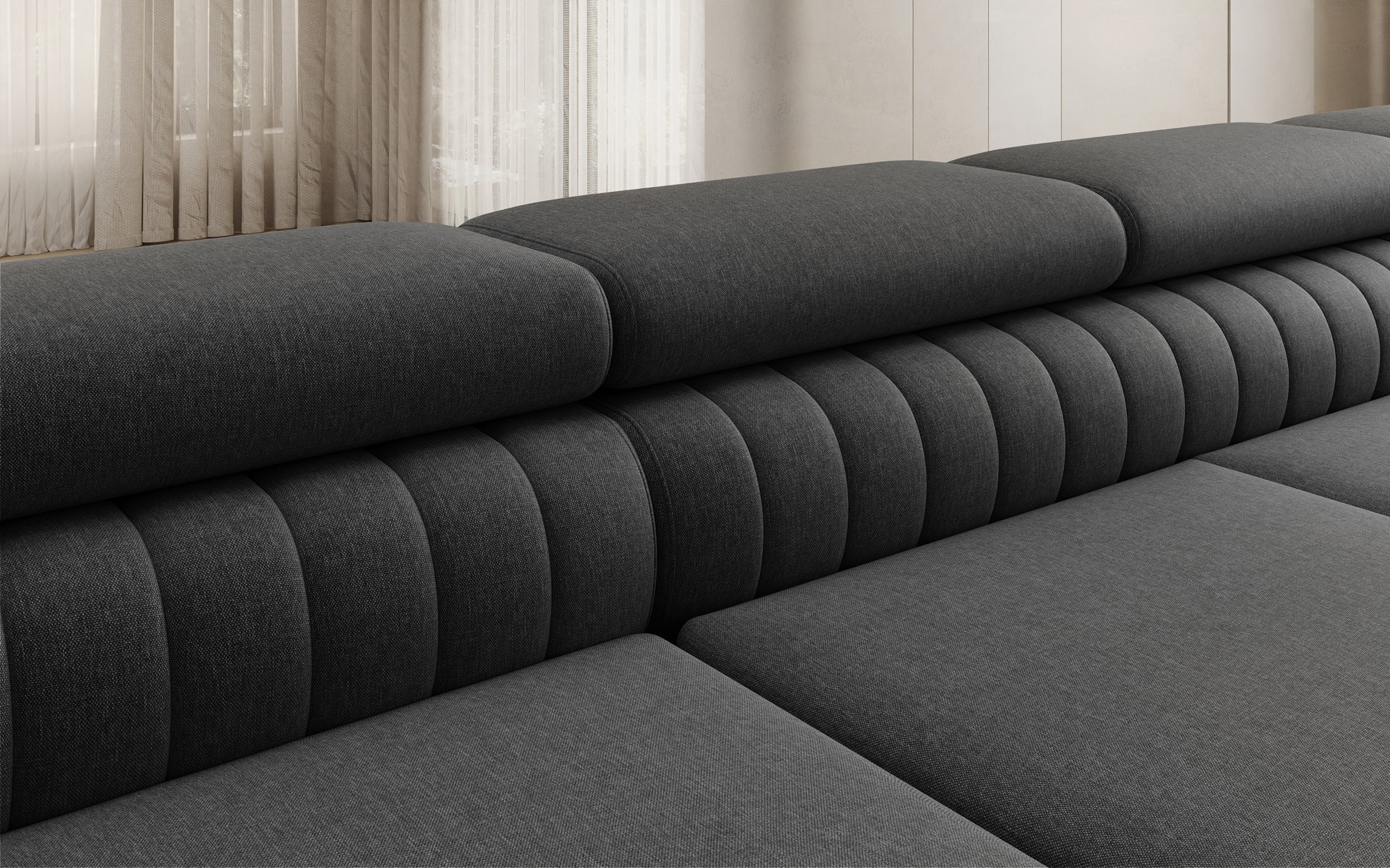 Rohová pohovka Louis je pohodlná, stylová a především funkční. Sedák se skládá z vlnových pružin a výplně z T30 a vysoce pružné HR pěny, která se dokonale přizpůsobí tělu a zvyšuje komfort. Rozměry rohové pohovky Louis — 347 x 202 x 92 cm — dále zvyšují úroveň pohodlí. Mezi jeho výhody patří čtyři nastavitelné opěrky hlavy, úložný prostor na lůžkoviny a velká spací plocha o rozměrech 254 x 123 cm. Kromě toho je mechanismus rozkládání „delfín“ použitý v tomto kusu jednoduchý a intuitivní. Můžete si také vybrat barvu čalounění rohové pohovky Louis z palety látkové kolekce Eltap. Designové nohy pohovky také stojí za zmínku — jsou vyrobeny z oceli, pochromované a vysoké, což dodává nábytku elegantní nádech. Estetické kvality jsou dále zdůrazněny vertikálním prošíváním na boku a zadní části pohovky Louis.