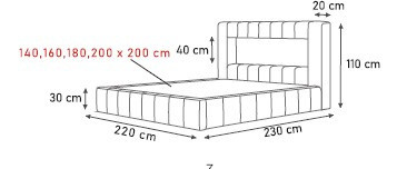 Délka: 230 cm Výška čela: 90 cm Výška sedáku: 30 cm Plocha na spaní: 200/200 cm Postel má kovový rám, LED osvětlení a úložný prostor na ložní prádlo