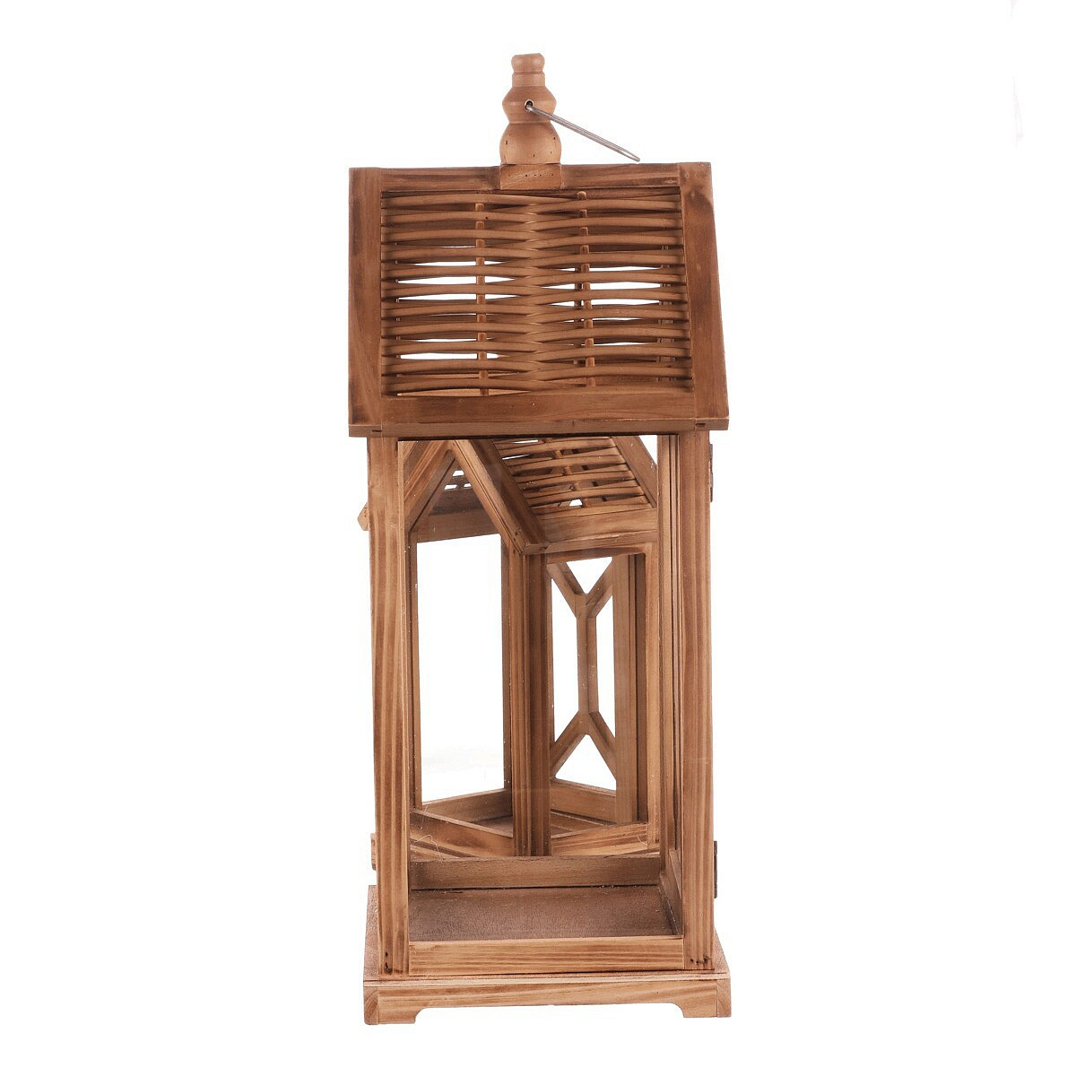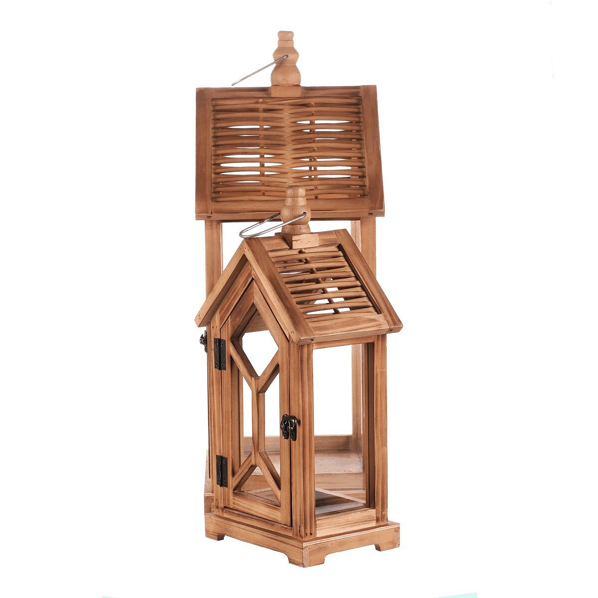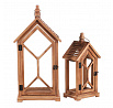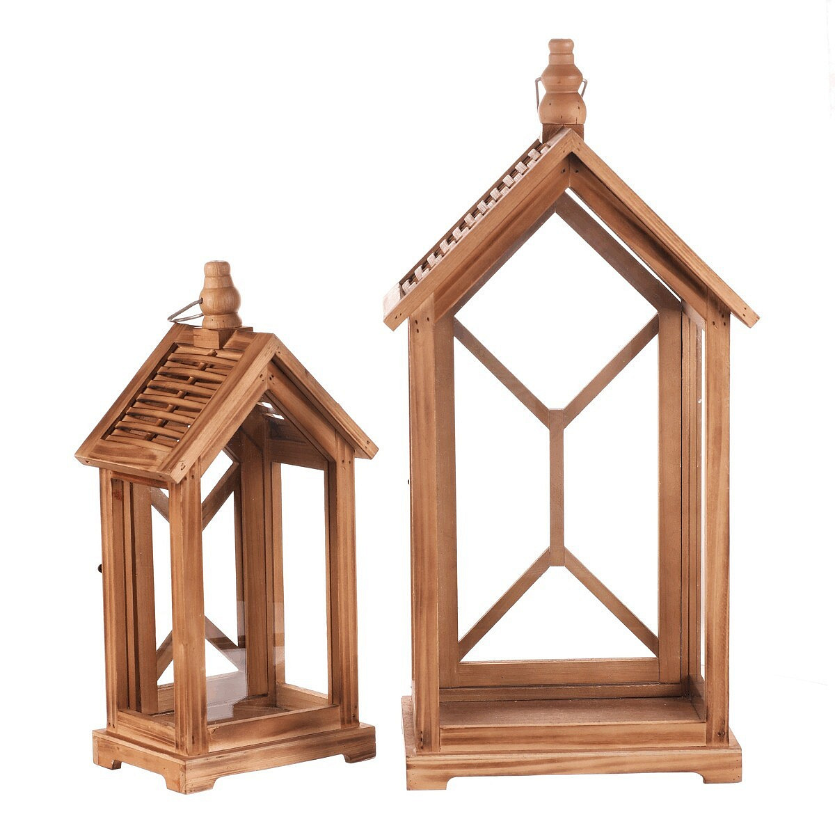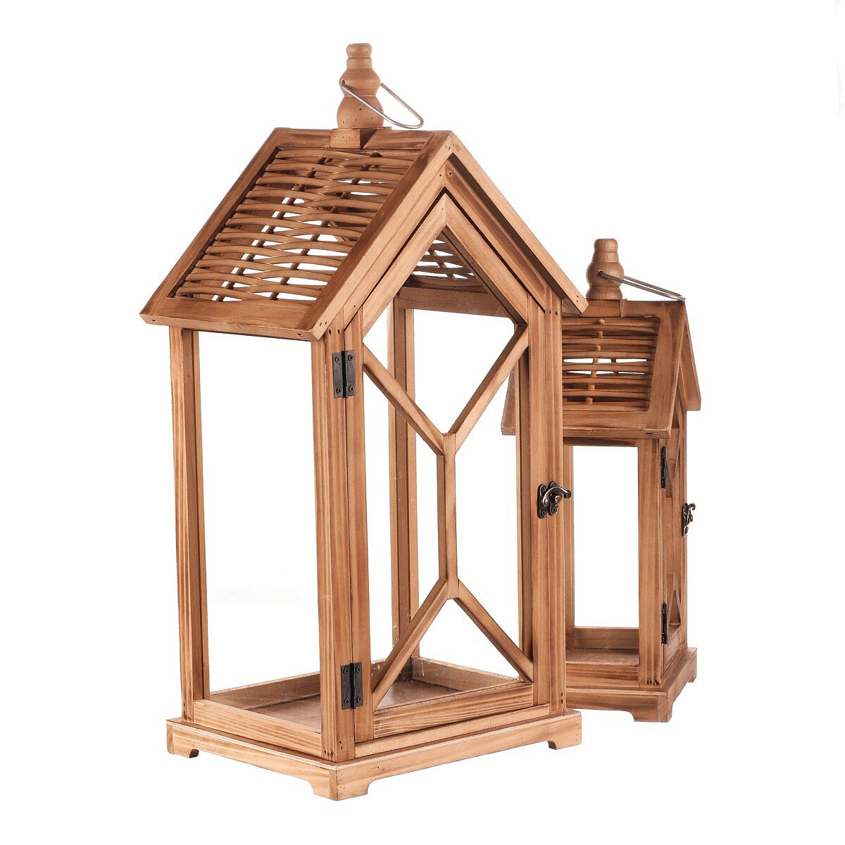Dřevěná lucerna ve tvaru domku v sadě dvou různě velkých kusů se skvěle hodí do každého interiéru i exteriéru. Celodřevěná konstrukce v přírodní barvě je doplněna velkými čirými skly na všech stranách, která umožňují plně vychutnat světlo svíčky. Elegantní dvířka přidávají na praktičnosti, zatímco malé kovové madlo na střeše umožňuje snadné přenášení.