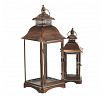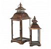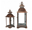 Sada dvou kovových luceren v měděném odstínu přináší do interiéru nebo exteriéru tradiční atmosféru s nádechem vintage stylu. Čtyřboké provedení s průhlednými skleněnými stěnami umožňuje rovnoměrné rozptýlení světla svíčky uvnitř. Lucerny jsou vybaveny praktickým otevíracím dvířkem a horním kovovým kroužkem pro snadné přenášení nebo zavěšení. Robustní kovová základna zajišťuje stabilitu a dlouhou životnost. Hodí se pro dekorativní osvětlení na terasu, balkon či do obývacího pokoje.