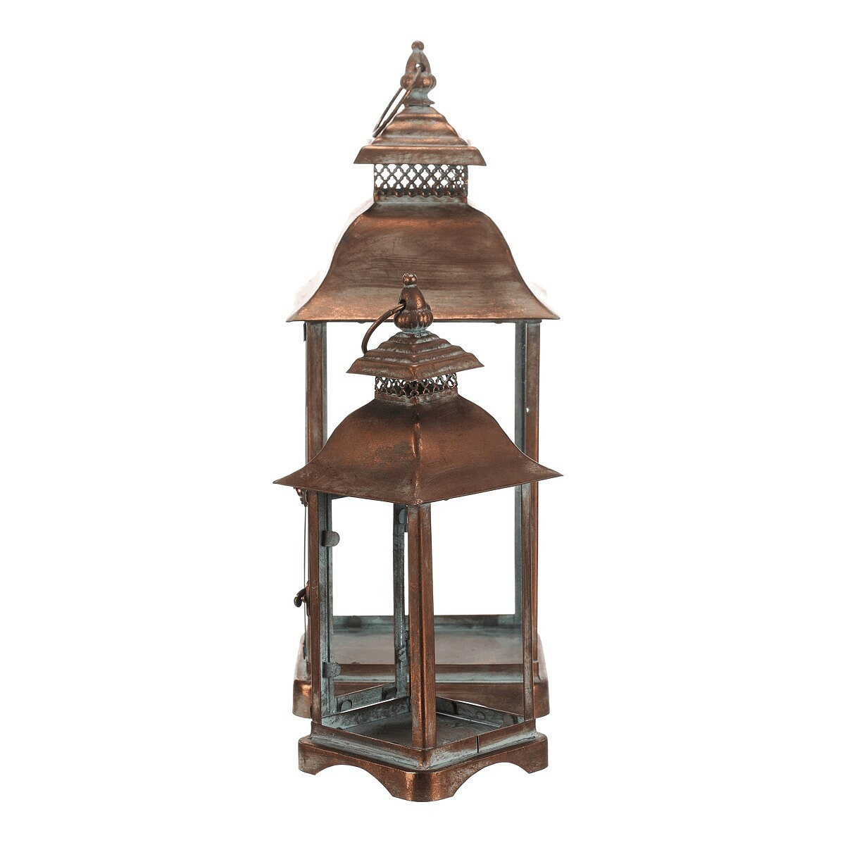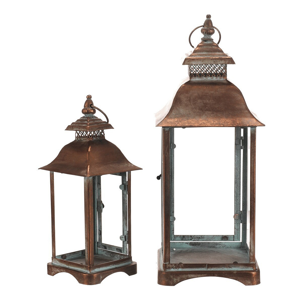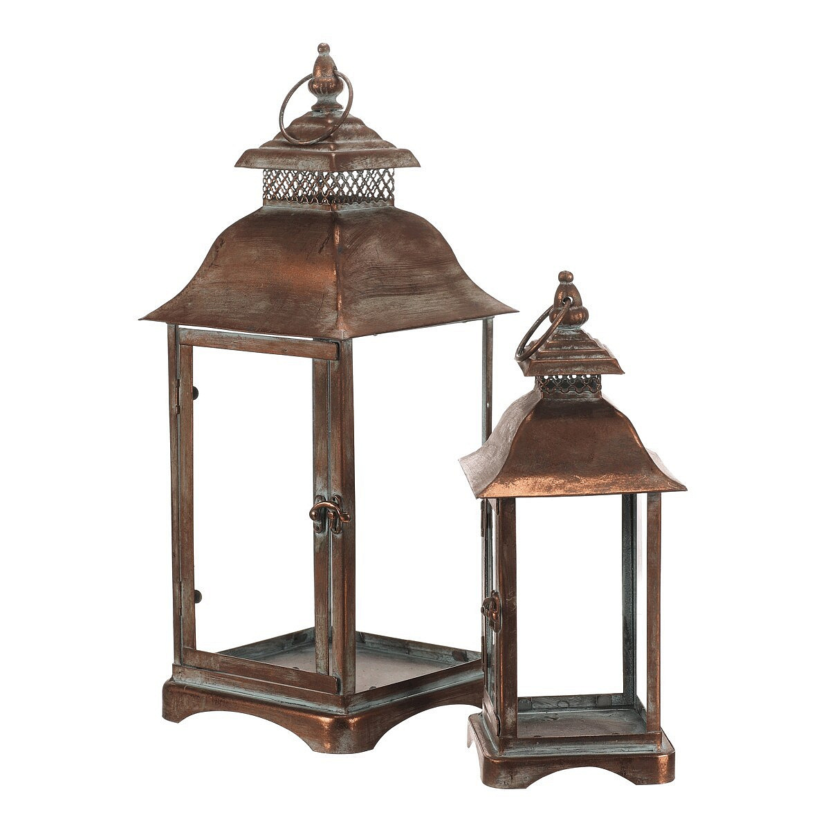 Sada dvou kovových luceren v měděném odstínu přináší do interiéru nebo exteriéru tradiční atmosféru s nádechem vintage stylu. Čtyřboké provedení s průhlednými skleněnými stěnami umožňuje rovnoměrné rozptýlení světla svíčky uvnitř. Lucerny jsou vybaveny praktickým otevíracím dvířkem a horním kovovým kroužkem pro snadné přenášení nebo zavěšení. Robustní kovová základna zajišťuje stabilitu a dlouhou životnost. Hodí se pro dekorativní osvětlení na terasu, balkon či do obývacího pokoje.