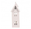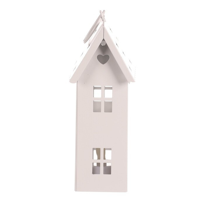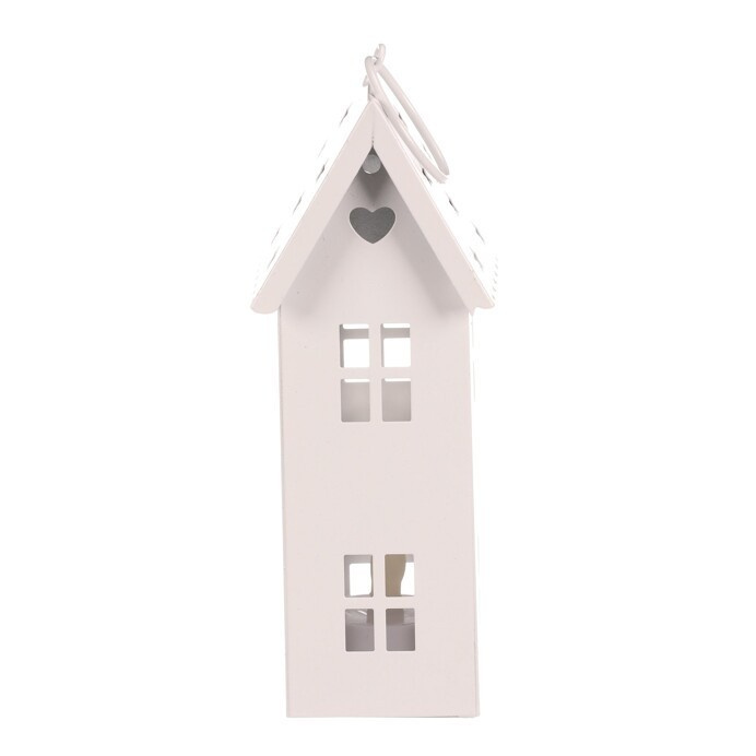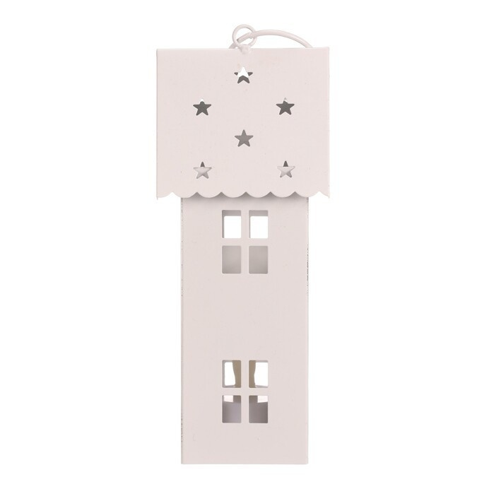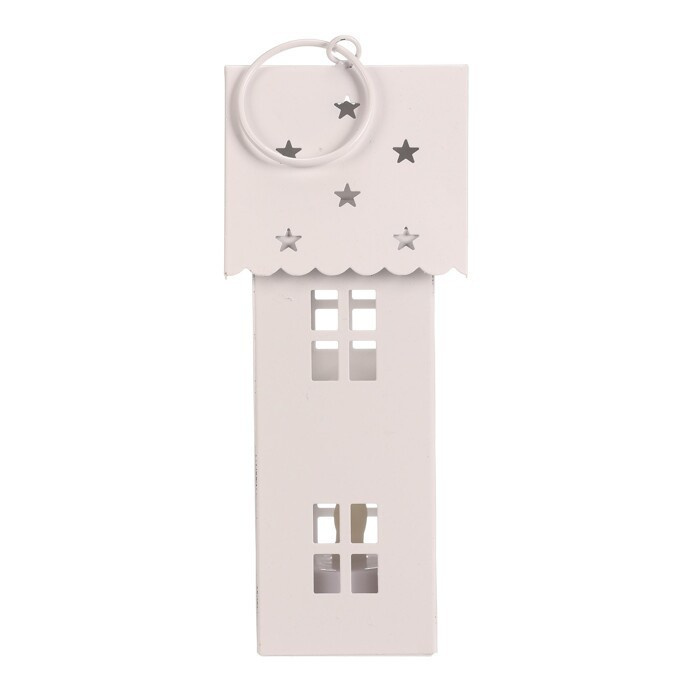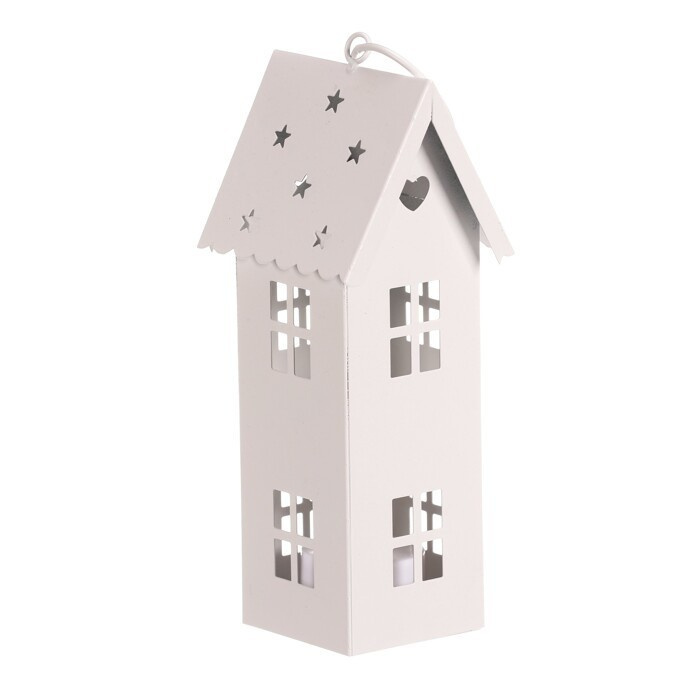 Mini kovová lucerna ve tvaru patrového domku je půvabnou dekorací pro váš interiér. Bílá barva jí dodává jemný vzhled, zatímco detailně zpracovaná okénka a hvězdičkové otvory ve stříšce krásně propouštějí světlo LED svíčky. Můžete ji postavit na stůl nebo zavěsit za očko a vytvořit si tak kouzelnou atmosféru.