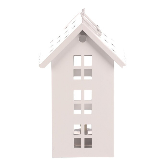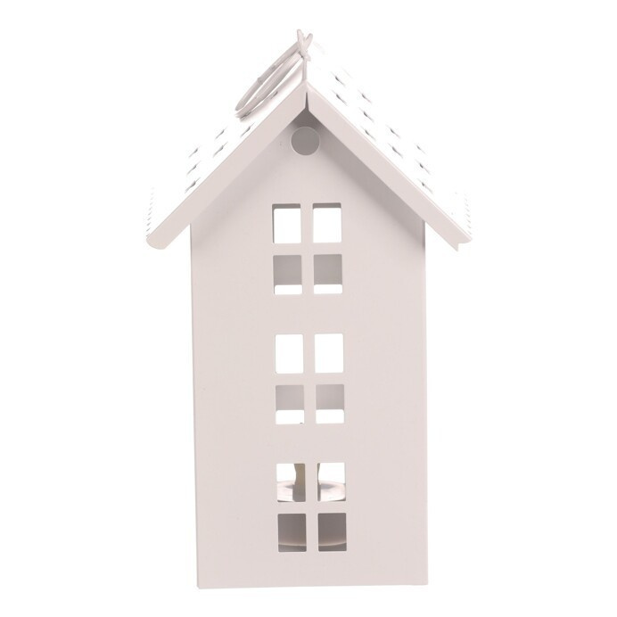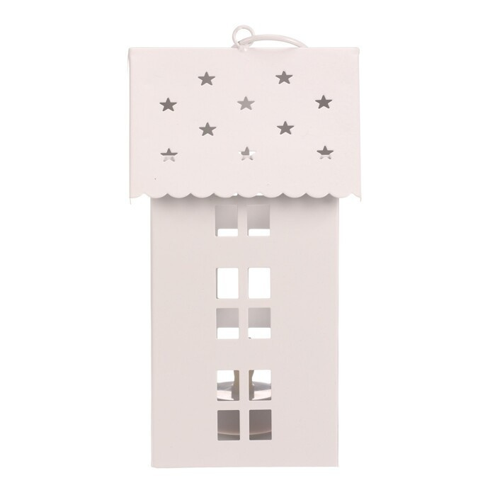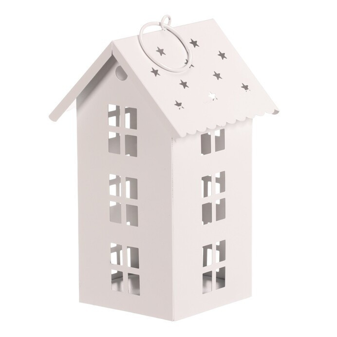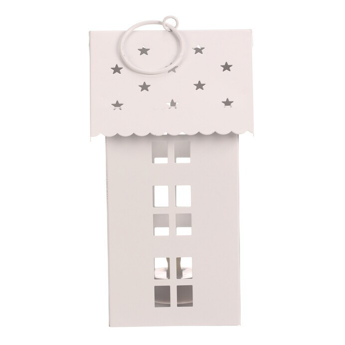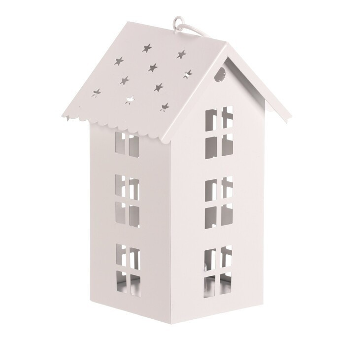 Mini kovová lucerna ve tvaru patrového domku je půvabnou dekorací pro váš interiér. Bílá barva jí dodává jemný vzhled, zatímco detailně zpracovaná okénka a hvězdičkové otvory ve stříšce krásně propouštějí světlo LED svíčky. Můžete ji postavit na stůl nebo zavěsit za očko a vytvořit si tak kouzelnou atmosféru.