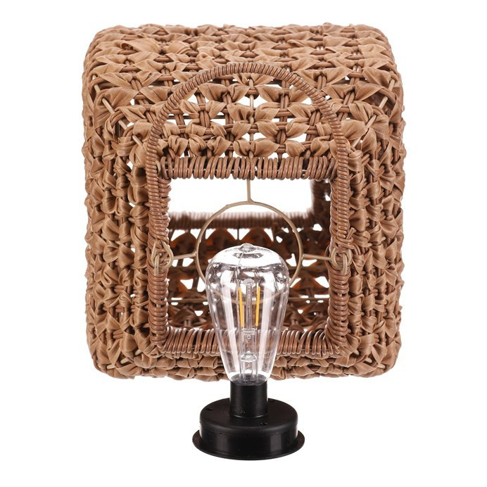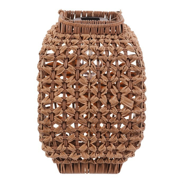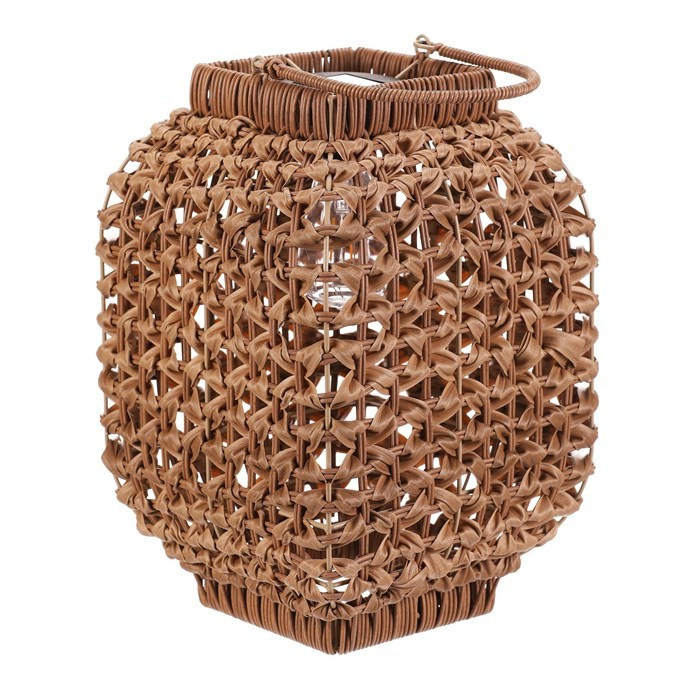 Lampión z polyratanu v světle hnědém odstínu nabízí příjemné LED osvětlení vhodné pro venkovní i vnitřní použití. Jeho hranaté provedení s otevřenou strukturou umožňuje efektivní rozptyl světla a zároveň vytváří dekorativní vizuální efekt. Praktické madlo usnadňuje přenášení nebo zavěšení lampiónu. Díky použití polyratanu je lampión navržen pro dlouhou životnost a snadnou údržbu, což z něj činí ideální doplněk pro terasy, balkony či zahrady. LED osvětlení je napájeno 1 x AA dobíjecí baterií a zároveň solárním panelem umístěným na horní hraně.