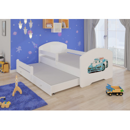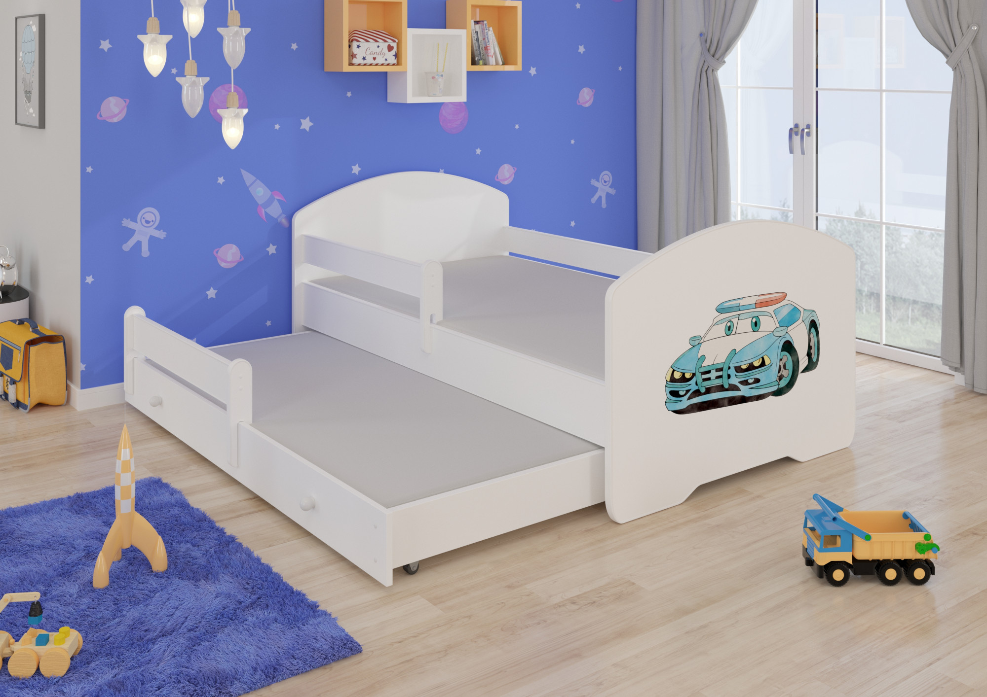 Dvojlůžko z kolekce PEPE II s jednoduchým tvarem má zásuvku s funkcí spaní, která se skvěle hodí do pokoje pro dva sourozence. Je také ideálním řešením pro návštěvu nečekaných hostů. Díky velkému výběru grafik snadno vybereš model, který nejlépe odpovídá zájmům tvého dítěte. V procesu výroby byly použity ekologické vodní barvy, které jsou bezpečné a odolné vůči mechanickému poškození. Navíc postel nemá ostré rohy a grafika je chráněna laminátem. Další výhodou je ochranná zábrana zajišťující bezpečnost během spánku a snímatelný potah matrace na zip, který lze snadno sundat a vyprat.