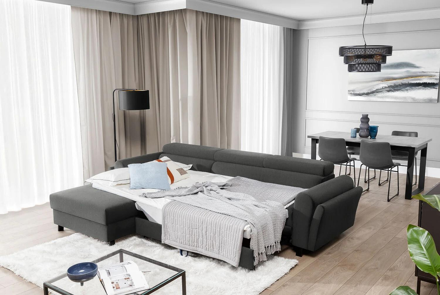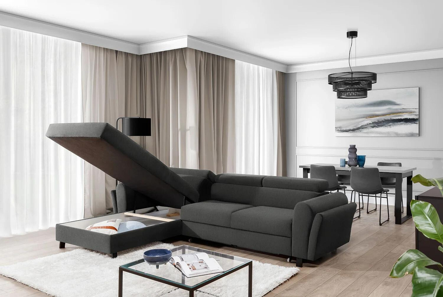 Jednou z hlavních předností této sedací soupravy je její praktická funkčnost. Díky možnosti rozkládání se snadno promění v pohodlné lůžko s plochou na spaní 110x240 cm, což je ideální pro hosty nebo pro příležitostné přespání. Navíc je vybavena úložným prostorem, který poskytuje dostatek místa pro uložení lůžkovin, polštářů nebo jiných potřebných věcí, čímž pomáhá udržovat váš obývací prostor čistý a uspořádaný.