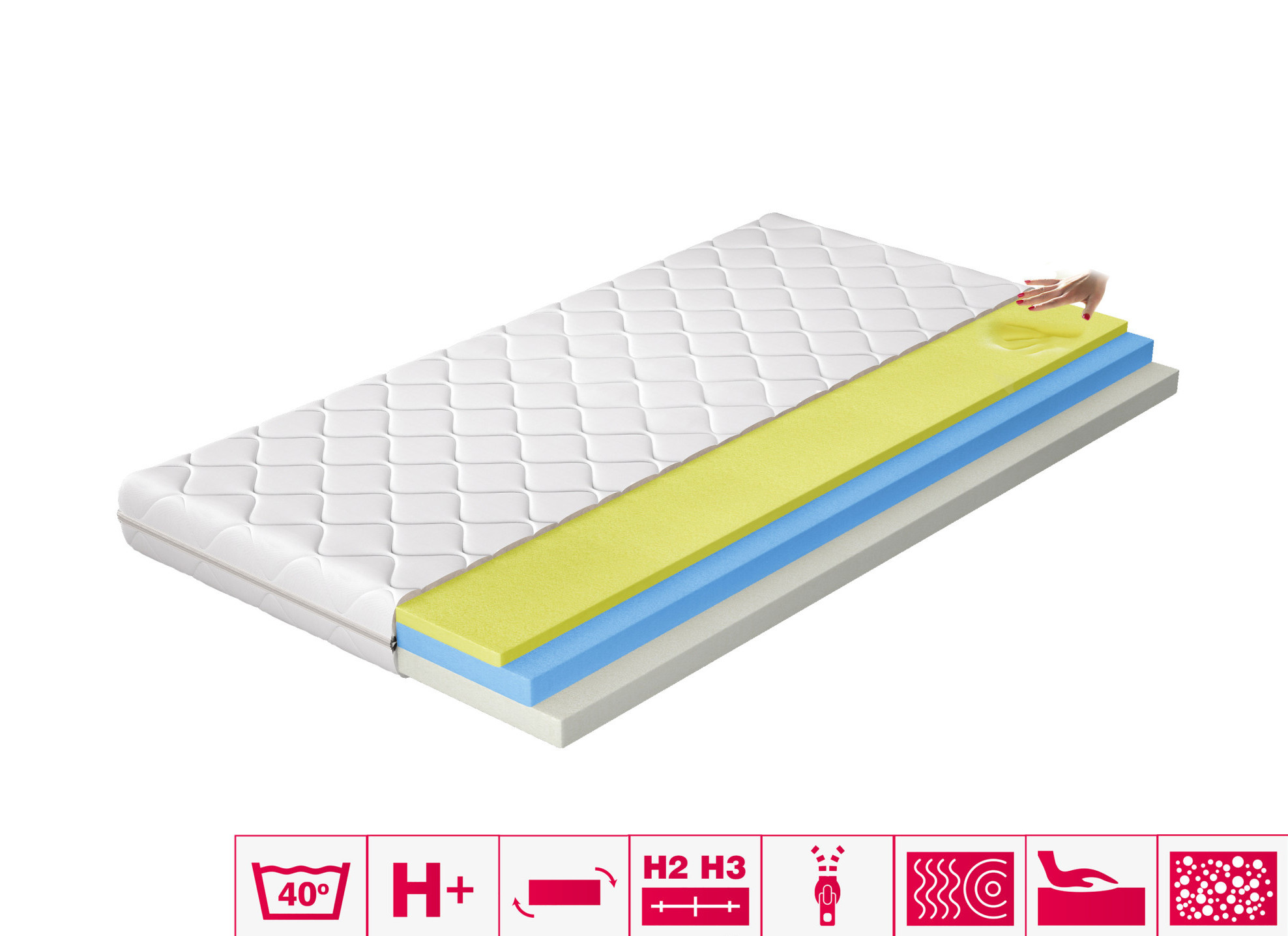 Matrace Simona je výrobek z nejkvalitnějších materiálů, ideální pro lidi, kteří si cení vynikající kvality spánku. Díky použití tří pěn je to mimořádně pohodlná matrace. Vysoce elastická HR pěna je obklopena Visco pěnou na jedné straně, která je extrémně měkká, a pěnou T2542 na druhé straně. Simona termoelastická matrace je pokryta snímatelným kašmírovým potahem.