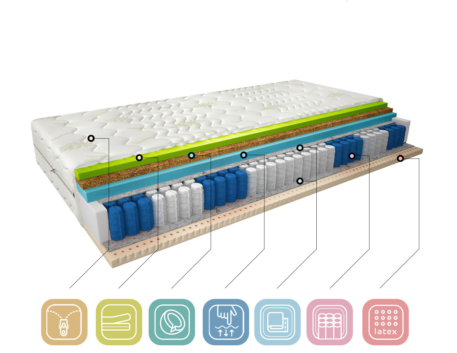 Pohodlný noční spánek je receptem na úspěšný den, proto si uvědomujeme důležitost výběru dokonalé matrace podle vašich preferencí. Termoelastická matrace Sola v potahu z aloe vera je ideální volbou pro lidi, kteří si cení kvalitního spánku. Matrace Sola se skládá z taštičkových pružin, které zajišťují, že matrace není vlnitá a nevibruje, a tří typů pěny. Latexová pěna na jedné straně a vysoce flexibilní HR pěna a Visco pěna na druhé straně, oddělené kokosovou deskou, která zvyšuje tvrdost matrace, celek je doplněn snímatelným potahem z aloe vera.