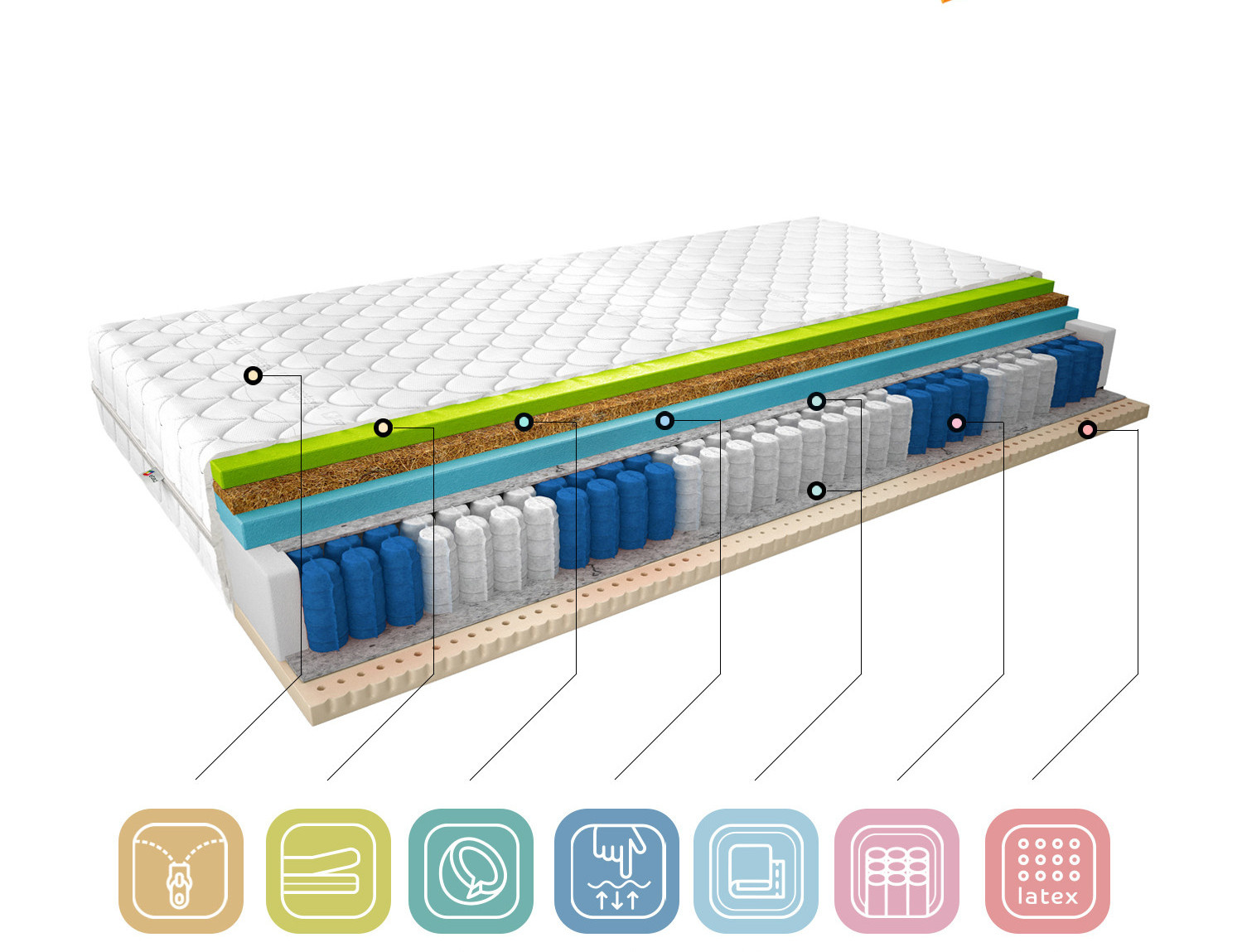 Pohodlný noční spánek je receptem na úspěšný den, proto si uvědomujeme, jak důležité je vybrat si dokonalou matraci podle vašich preferencí. Termoelastická matrace Sola ve stříbrném potahu je ideální volbou pro lidi, kteří si cení kvalitního spánku. Matrace Sola se skládá z taštičkových pružin, díky kterým matrace nevlní ani nevibruje, a tří typů pěny. Latexová pěna na jedné straně a vysoce flexibilní HR pěna a Visco pěna na druhé straně, oddělené kokosovou deskou, která zvyšuje tvrdost matrace, celek je doplněn snímatelným stříbrným potahem.