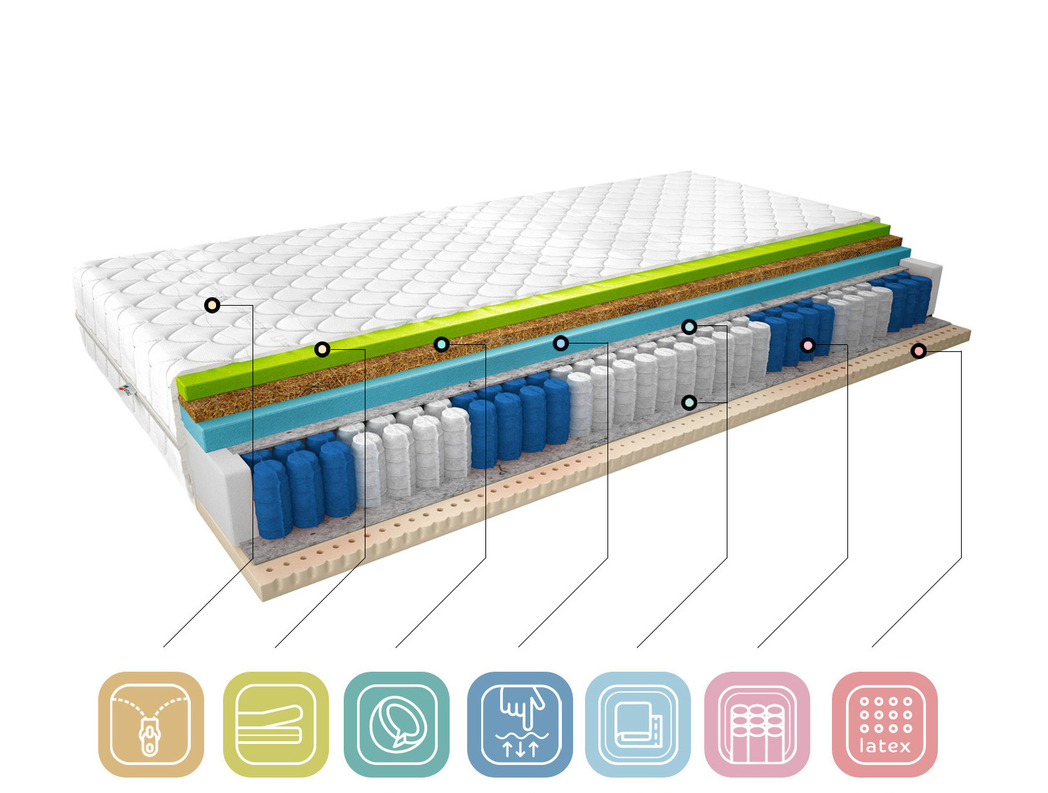 Pohodlný noční spánek je receptem na úspěšný den, proto si uvědomujeme, jak důležité je vybrat si dokonalou matraci podle vašich preferencí. Termoelastická matrace Sola ve stříbrném potahu je ideální volbou pro lidi, kteří si cení kvalitního spánku. Matrace Sola se skládá z taštičkových pružin, díky kterým matrace nevlní ani nevibruje, a tří typů pěny. Latexová pěna na jedné straně a vysoce flexibilní HR pěna a Visco pěna na druhé straně, oddělené kokosovou deskou, která zvyšuje tvrdost matrace, celek je doplněn snímatelným stříbrným potahem.