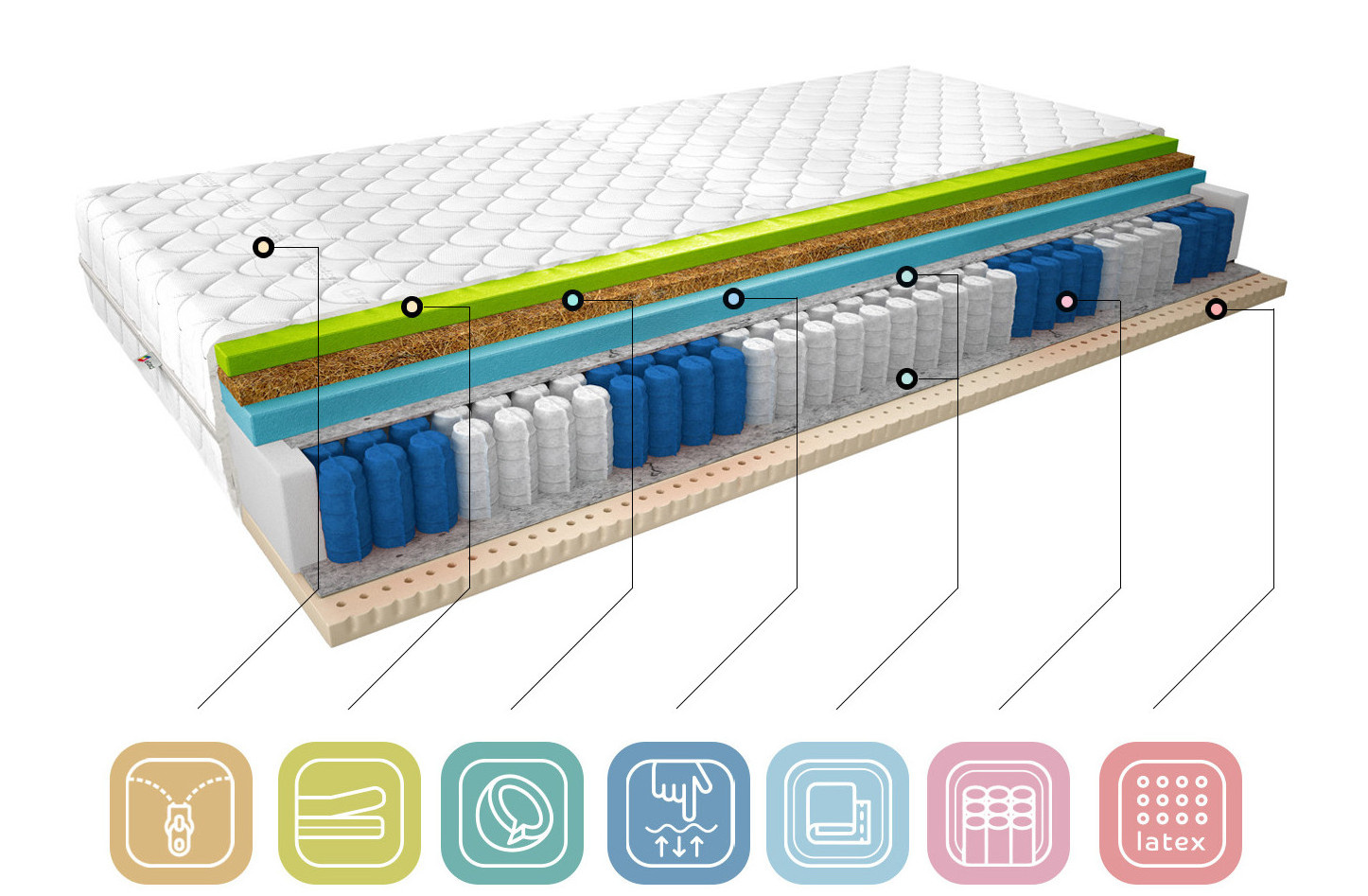 Pohodlný noční spánek je receptem na úspěšný den, proto si uvědomujeme, jak důležité je vybrat si dokonalou matraci podle vašich preferencí. Termoelastická matrace Sola ve stříbrném potahu je ideální volbou pro lidi, kteří si cení kvalitního spánku. Matrace Sola se skládá z taštičkových pružin, díky kterým matrace nevlní ani nevibruje, a tří typů pěny. Latexová pěna na jedné straně a vysoce flexibilní HR pěna a Visco pěna na druhé straně, oddělené kokosovou deskou, která zvyšuje tvrdost matrace, celek je doplněn snímatelným stříbrným potahem.