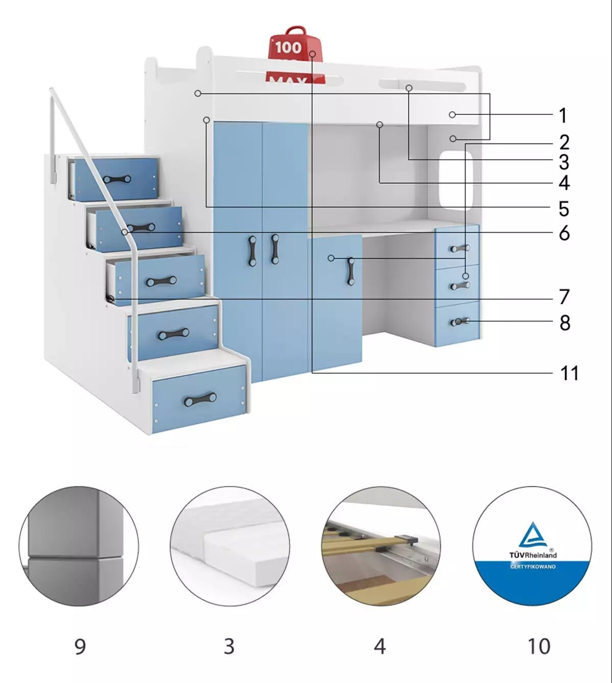 Patrová postel MAX 4 bez matrace, Bílá/Modrá
