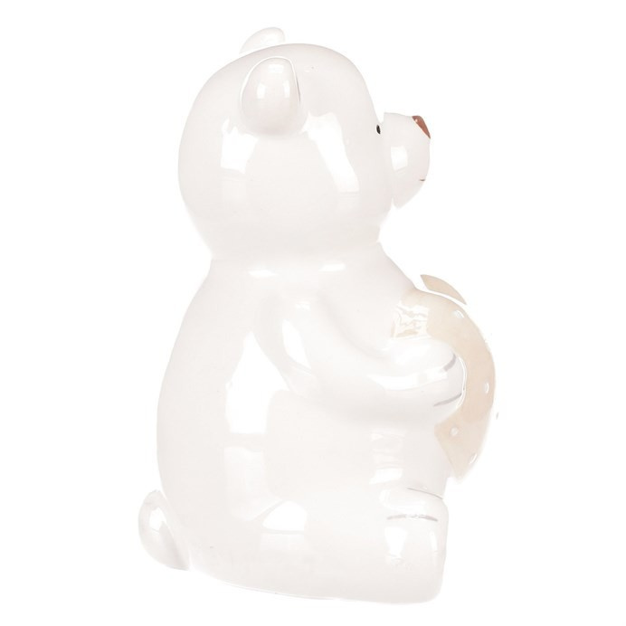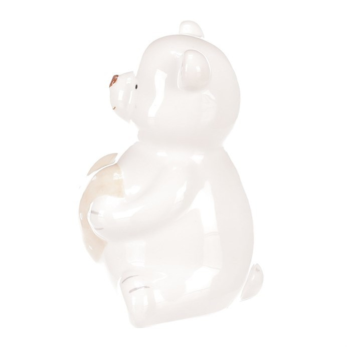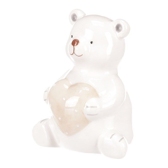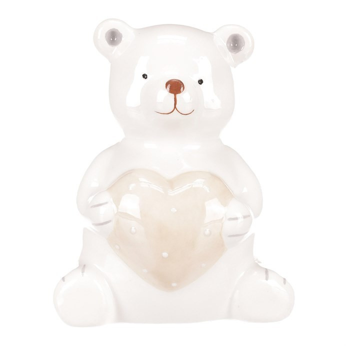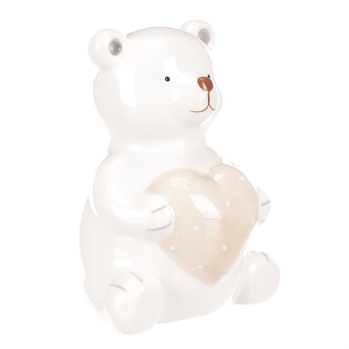 Bílý keramický medvídek držící srdce vás okamžitě očaruje svým úsměvem a roztomilým vzhledem. Tato dekorační figurka je ideální pro umístění na poličku, stůl, komodu nebo kamkoliv jinam, kde bude moci vyniknout svým půvabem. Jeho milý výraz má neuvěřitelnou schopnost rozdávat radost a šířit pozitivní energii, a může tak být skvělým dárkem pro milovanou osobu. Jeho přítomnost v místnosti automaticky vnáší do éteru špetku optimismu a jeho nakažlivý úsměv zpříjemní každý okamžik. Najděte tomuto kamarádovi z keramiky skutečně pěkné místo, kde bude plnit úlohu zářícího symbolu pohody a radosti, a to i o vánočních svátcích.