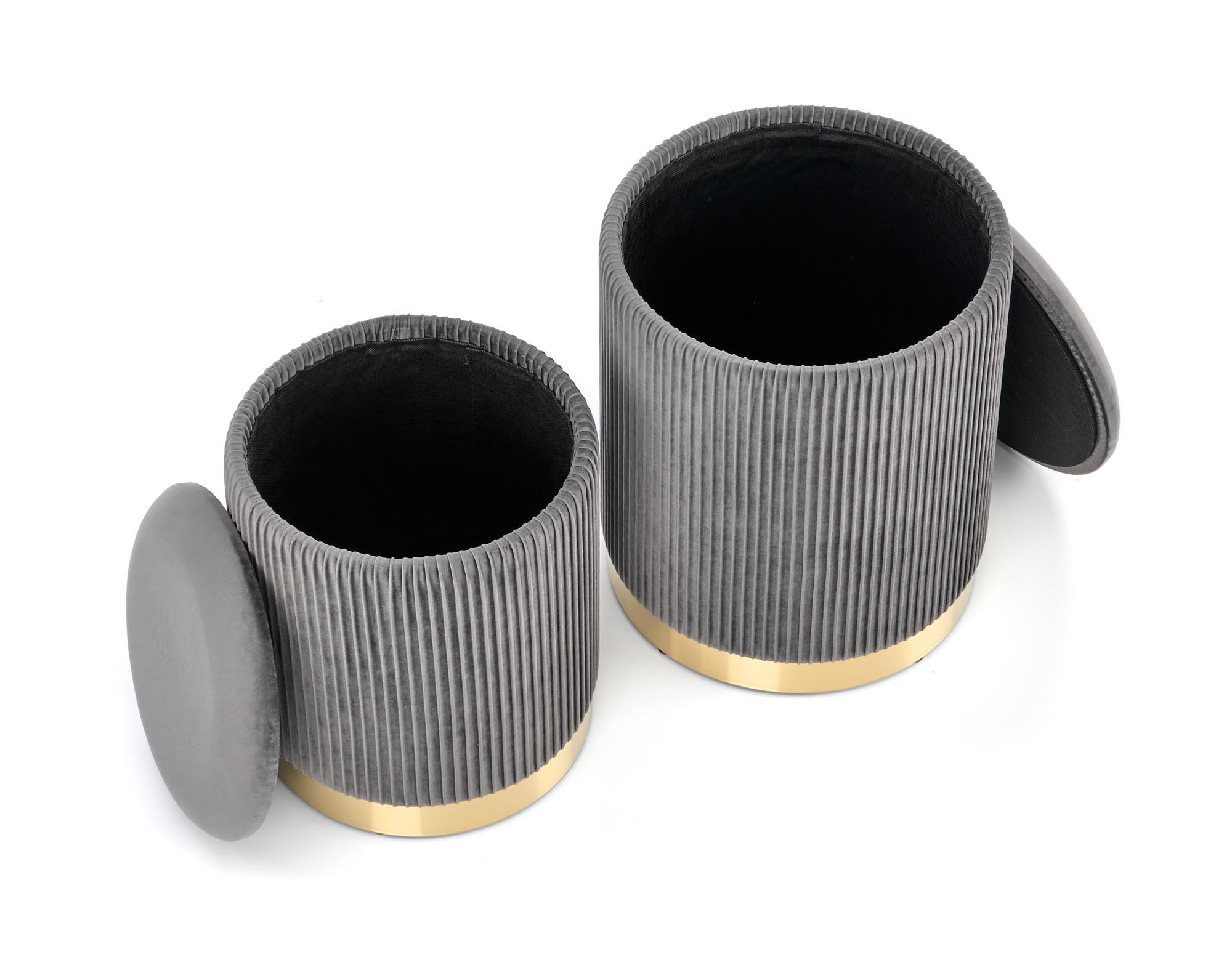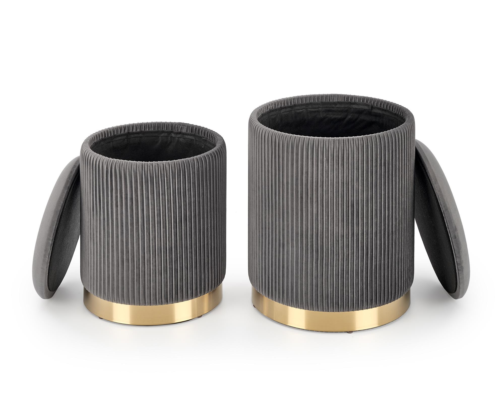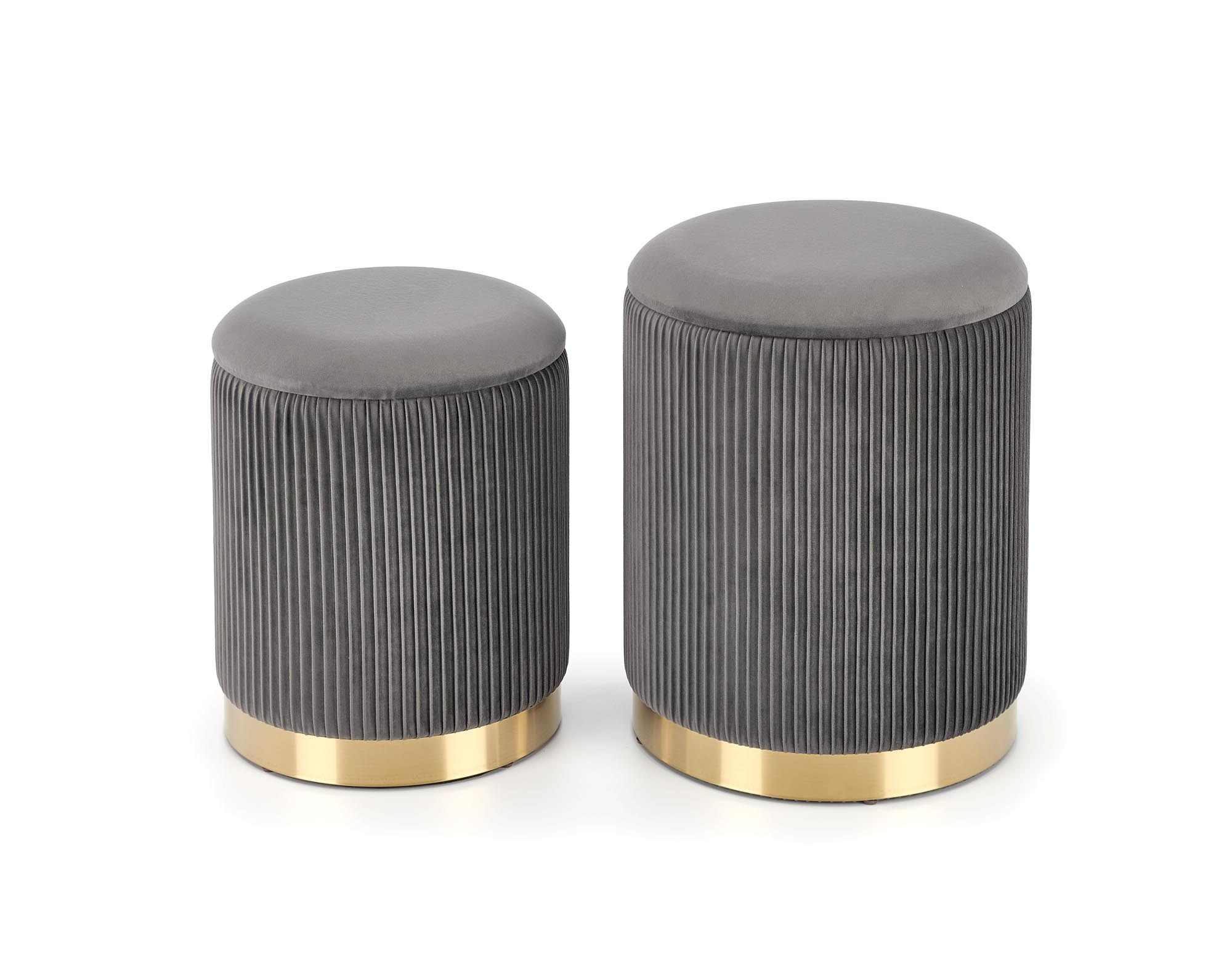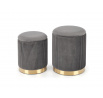 rozměry: 36/44 a 31/38 cm, sada 2 pufů, materiál: látka / chromovaná ocel, barva: šedá / zlatá