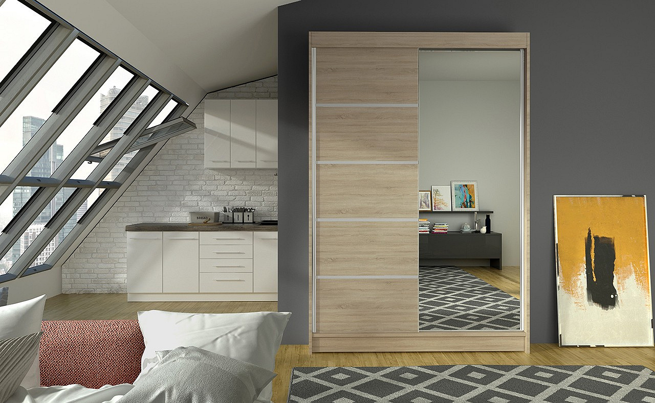 Posuvná skříň se zrcadlem NICEA je ideálním způsobem, jak uspořádat prostor. Nábytek je vybaven prostornými policemi a tyčí, na kterou můžete pověsit šaty, obleky, svrchní oděvy nebo košile. Na čelní straně bylo připevněno zrcadlo, které opticky zvětšuje prostor. Díky tomu, že skříň je posuvná, nemusíte vyčleňovat další místo na otevření dveří, což z ní činí ideální řešení pro malý pokoj nebo úzkou předsíň.