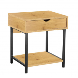 ROZMĚRY: - hloubka: 40 cm - šířka: 48 cm - výška: 53 cm MATERIÁL: - deska: laminovaná deska - rám: kov lakovaný práškovou barvou BARVA: - deska: přírodní dub - rám: černý OSTATNÍ: - zásuvka
