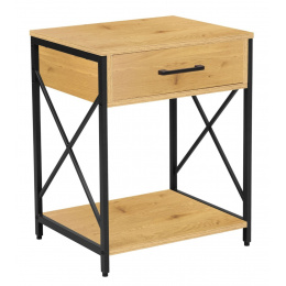 ROZMĚRY: - hloubka: 40 cm - šířka: 48 cm - výška: 60 cm MATERIÁL: - deska: laminovaná deska - rám: kov lakovaný práškovou barvou BARVA: - deska: přírodní dub - rám: černý OSTATNÍ: - zásuvka
