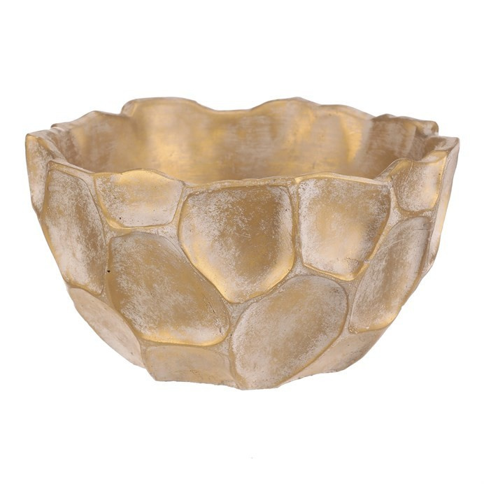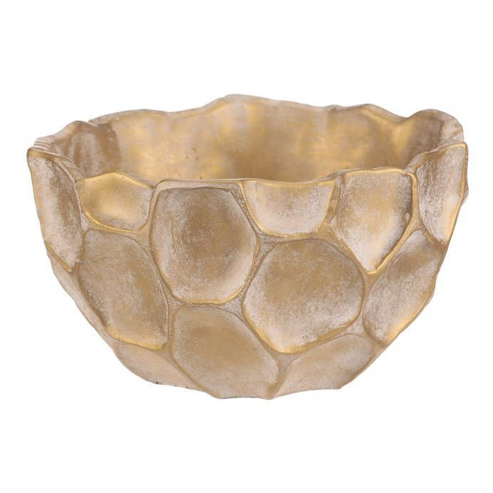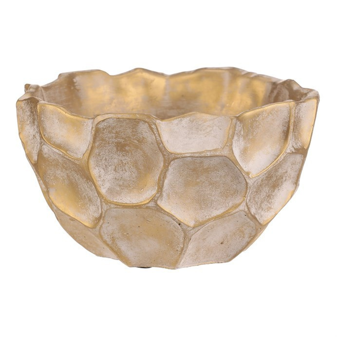 Béžovo-zlatý obal na květiny ve tvaru misky se vzorem připomínajícím plástev s nepravidelnými šestiúhelníkovými vzory, bude nádherným doplňkem zejména pro sváteční výzdobu. Je betonový, což zajišťuje jeho stabilitu, díky které bude pevným základem pro vaše oblíbené květiny, přízdoby a další dekorace.