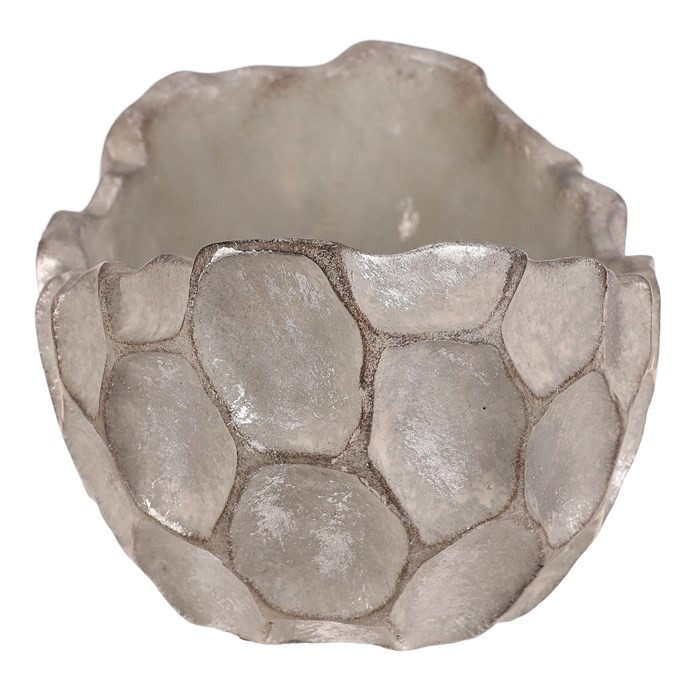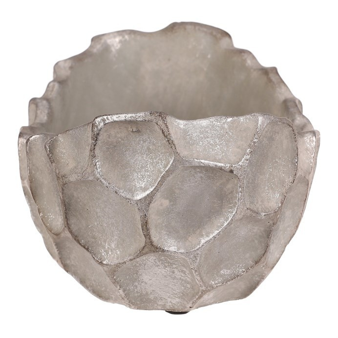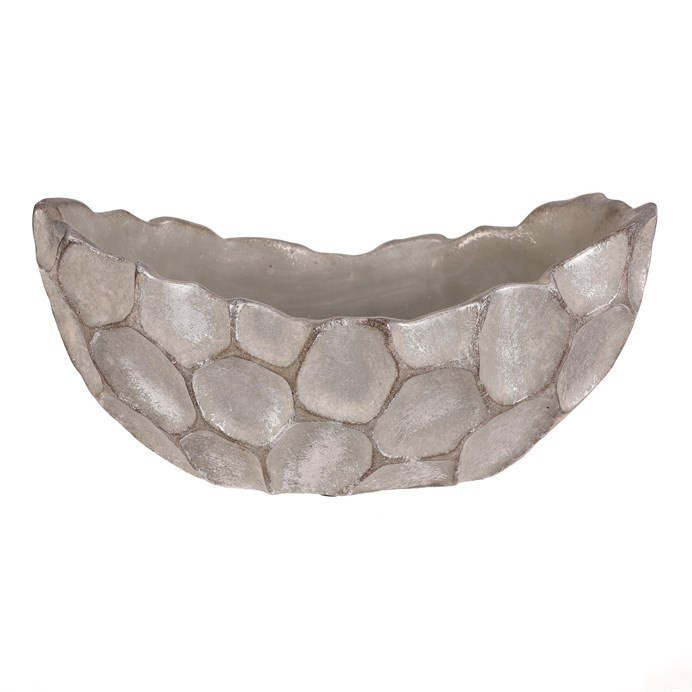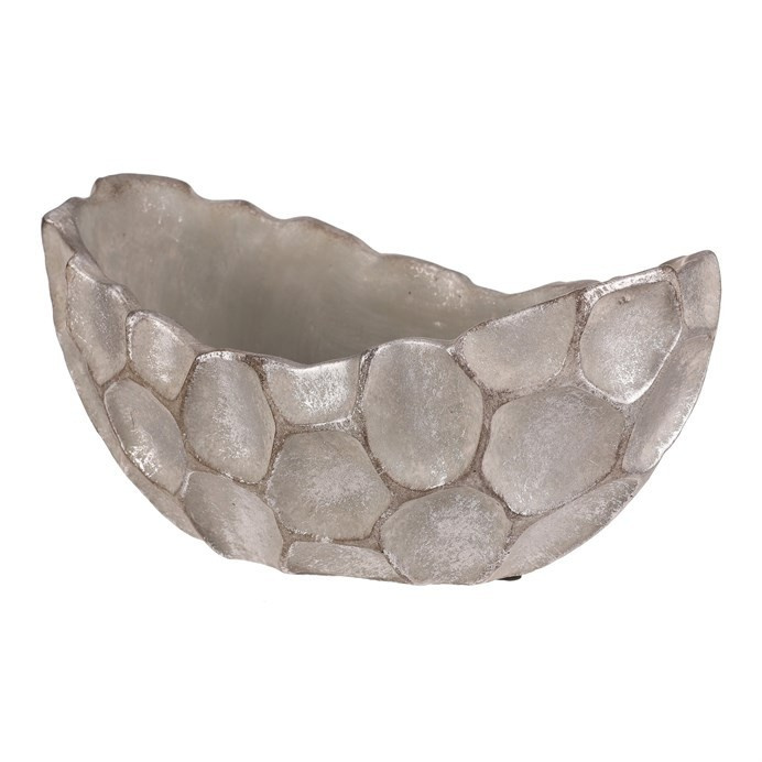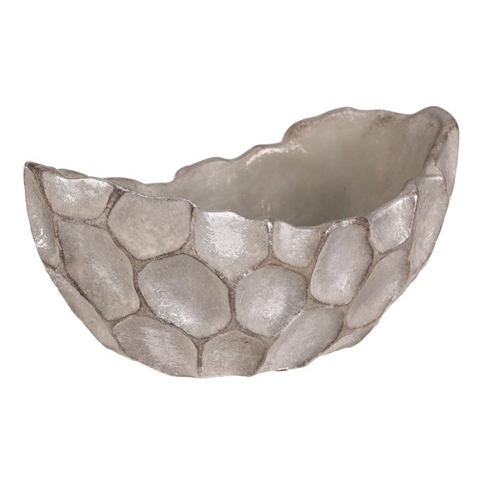 Betonový obal ve tvaru vaničky s povrchovou úpravou ve stříbrno-šedé barvě zaujme svým vzorem připomínajícím buňky. Jeho robustní základ z betonu je navržen pro dlouhou životnost a snadnou údržbu. Organický tvar a nepravidelný reliéf dodávají dekoraci přírodní a moderní vzhled, který vynikne v interiérech i exteriérech. Obal je vhodný pro umístění květin nebo drobných dekorativních předmětů, přičemž jeho stabilní základna zajišťuje pevné postavení na různých površích.