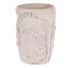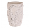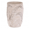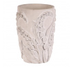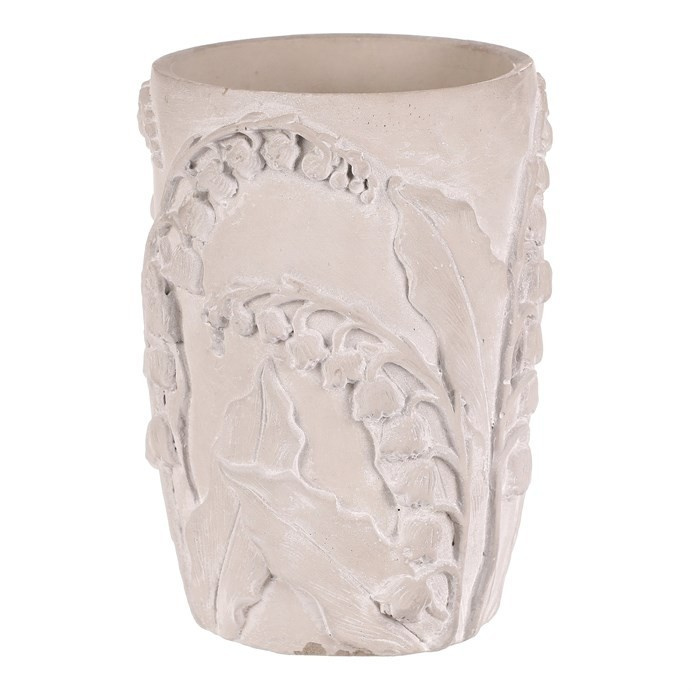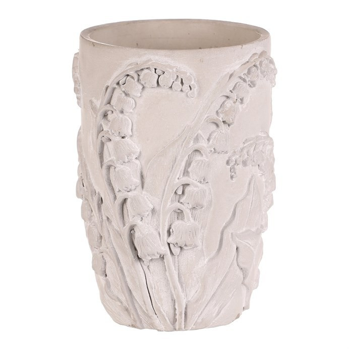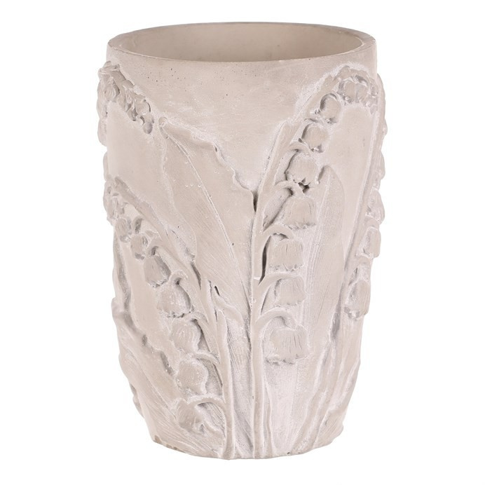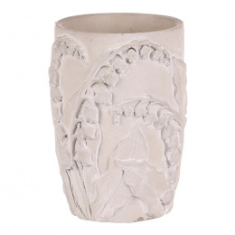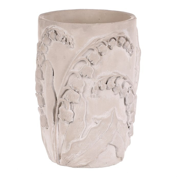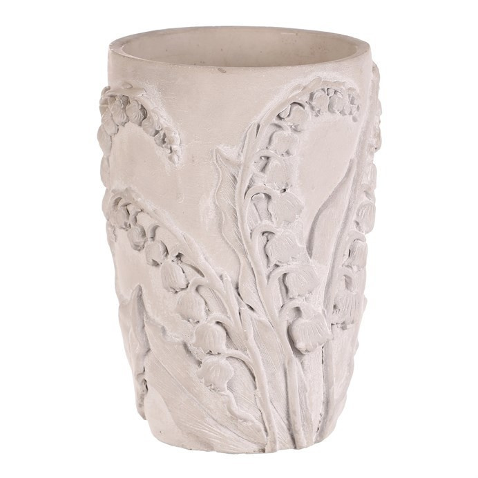 Betonový obal na květiny ve světle šedém odstínu je zdobený reliéfním vzorem konvalinek, který dodává přírodní a rustikální vzhled. Jeho pevná struktura z betonu zajišťuje stabilitu a dlouhou životnost, přičemž povrchová úprava zachovává surový charakter materiálu. Obal střední velikosti je vhodný pro různé druhy rostlin a díky neutrální barvě snadno zapadne do různých interiérů i exteriérů. Jeho robustní provedení umožňuje bezpečné umístění na terasu, balkon či do zahrady.