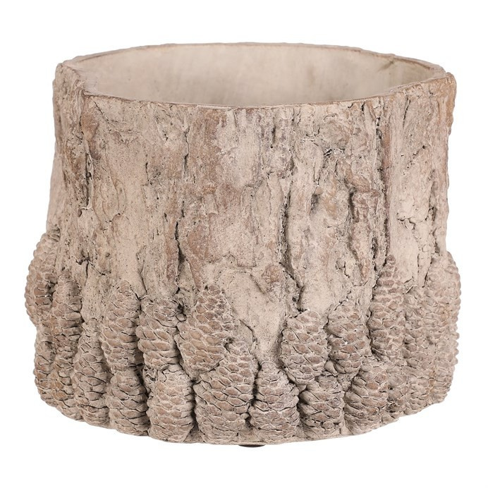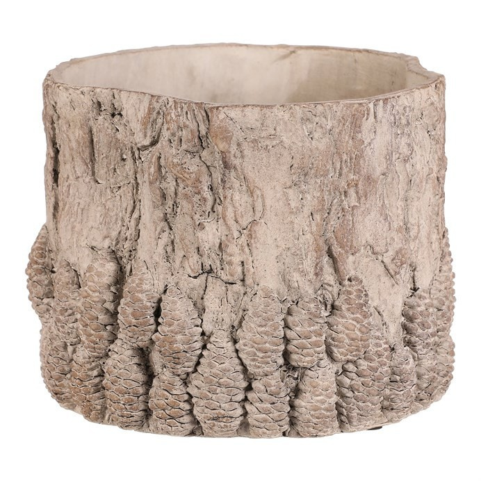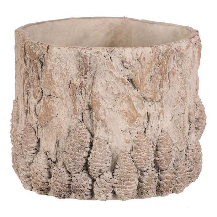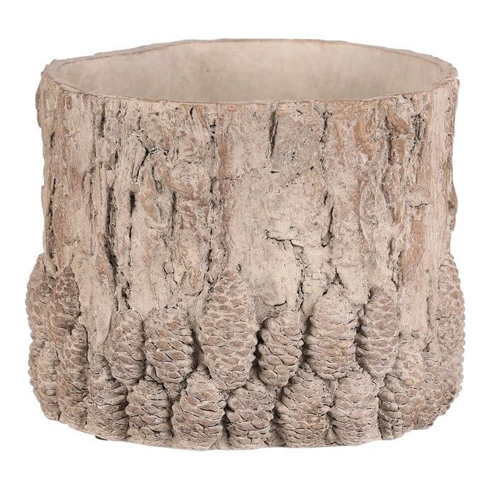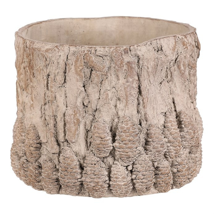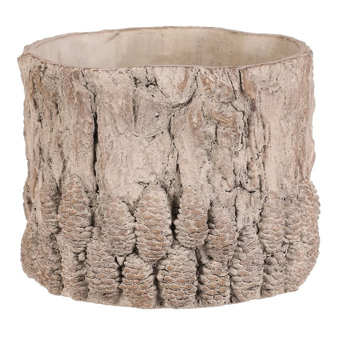 Betonový obal v světle šedém odstínu je navržen s povrchem připomínajícím přírodní kůru stromu doplněnou o reliéfní motiv šišek, které dodávají dekorativní a přírodní vzhled. Jeho robustní základ z betonu zajišťuje stabilitu a dlouhou životnost, přičemž materiál se snadno udržuje. Větší velikost L umožňuje použití pro různé rostliny či aranžmá, které vyniknou díky texturovanému provedení. Obal je vhodný pro interiérové i exteriérové umístění, kde podtrhne rustikální nebo přírodní styl prostoru.